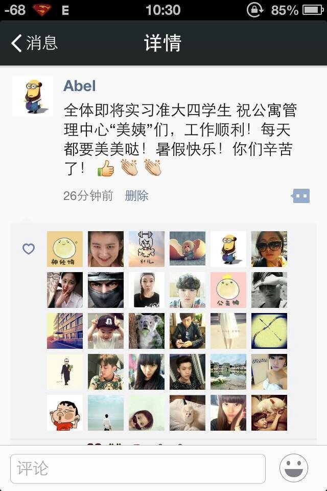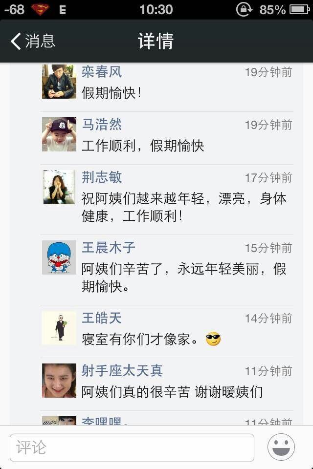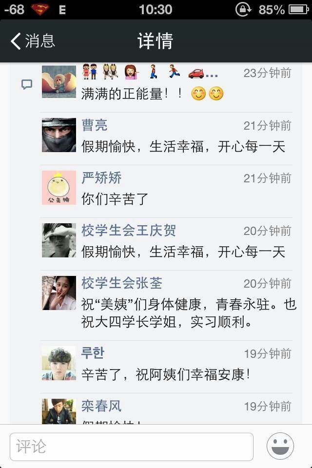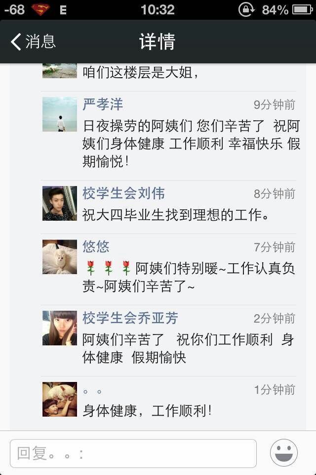 有不少学生选择在网上留下对阿姨们最衷心的感谢、祝福;学生会主席龚鹏同学代表即将实习的准大四学生也在微信朋友圈中由衷的留言,并得到积极的响应: