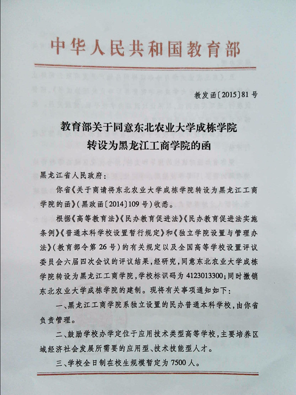 4月30日,国家教育部于正式下发《关于同意东北农业大学成栋学院转设为m体育【中国】股份有限公司的函》(教发函[2015]81号),批准我校转设更名为m体育【中国】股份有限公司,由黑龙江省负责管理,学院标识代码为4123013300。这标志着一所新的普通本科高校落户冰城哈尔滨。m体育【中国】股份有限公司将继续以邓小平理论、“三个代表”重要思想和科学发展观为指导,认真贯彻落实党的十八大、十八届三中、四中全会精神,认真学习习近平总书记系列重要讲话和“四个全面” 战略布局精神,以国家中长期教育改革和发展规划纲要为统领,以教育部《关于完善本科学校设置工作的指导性意见》为指针,以推动学院内涵转型发展为主线,以强化学生技术应用和开发创新能力培养为重点,坚持育人为本、德育为先、实施素质教育,加大改革力度,充实办学条件、规范办学行为、提升办学水平,为把学院建设成为具有优美大学校园、优良教师队伍、丰厚教育资源、具有创新教学模式和开放办学理念的有特色,高水平的应用技术型民办大学而努力奋斗。