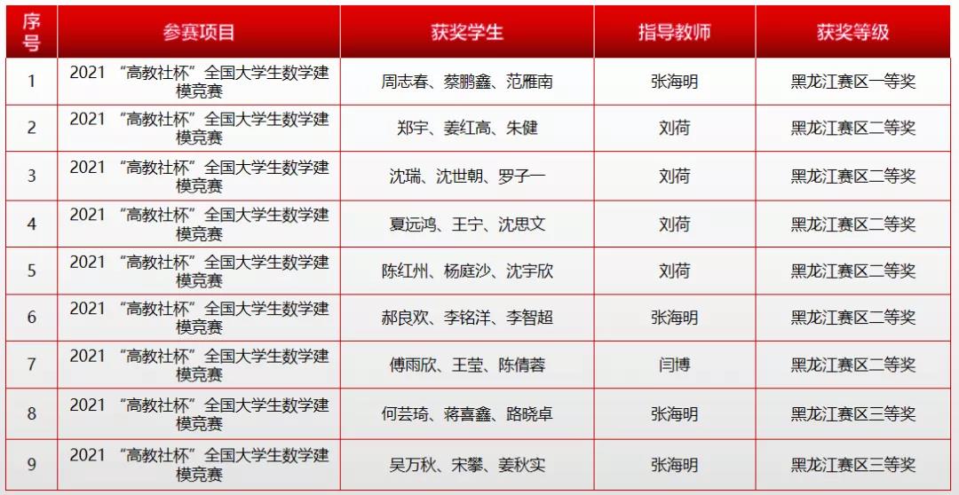 图说:2021 “高教社杯”全国大学生数学建模竞赛落下帷幕,经过组委会层层筛选、严格评审,通识教育部教师带领的22组参赛队伍共斩获9项奖项,其中一等奖1项,二等奖6项,三等奖2项。另外,在2021年8月举办的东北三省数学建模联赛中,通识教育部四位教师带领的25组参赛队伍,共斩获奖项11项,其中一等奖3项,二等奖4项,三等奖4项。