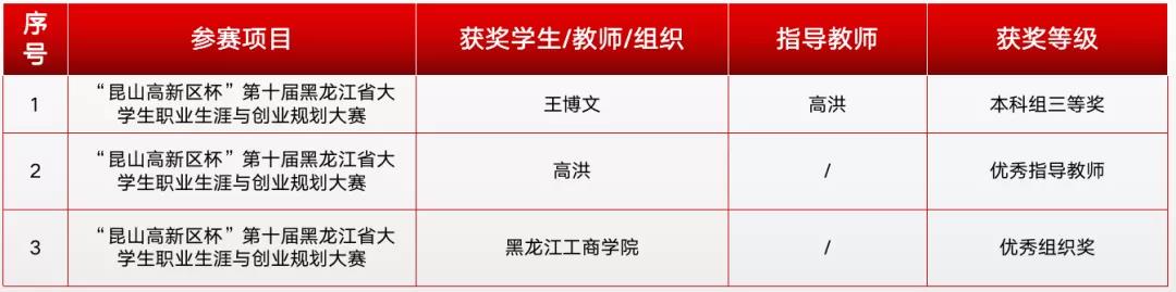 图说:为展现龙江学子的青春风采和高校就业创业指导工作的丰硕成果,达到以赛促学、以赛促建、以赛促提升的目的。“昆山高新区杯”第十届黑龙江省大学生职业生涯与创业规划大赛在哈尔滨举行,我校管理学院王博文同学喜获大赛本科组三等奖、最佳创意奖个人单项奖,指导教师高洪荣获大赛优秀指导教师奖,我校喜获大赛优秀组织奖。