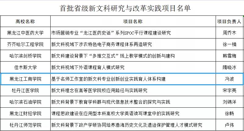 图说:黑龙江省教育厅下发了《关于公布首批国家级和省级新文科研究与改革实践项目的通知》(黑教高函〔2021〕204号),由我校管理学院冯波副教授牵头的课题《基于名师工作室的新文科专业创新创业实践育人体系构建》喜获省级培育项目。本次获批省级新文科研究与改革实践项目,是学校新文科建设取得阶段性成果。