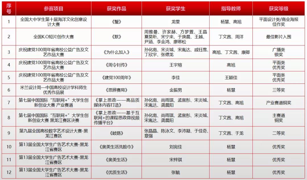 图说:艺术与传媒学院学子在全国大学生广告艺术大赛、全国高校数字艺术设计大赛(未来设计师NCDA大赛)、2021“米兰设计周赛事”、全国大中学生第十届文化创意设计大赛等多项艺术设计领域的高水平知名赛事中,斩获六项奖项。这些大赛均为艺术设计领域具有较高水平、较大影响力的赛事,起点高、规模大、覆盖面广,不仅吸引了高校艺术设计类专业师生参赛,还得到了业界的普遍关注。
