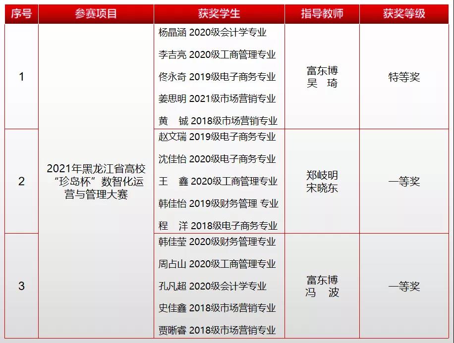 图说:11月20日,由黑龙江省普通高等学校创新创业教育指导委员会主办,黑龙江省教育厅高等教育处支持举办,我校承办的2021年黑龙江省高校“珍岛杯”数智化运营与管理大赛落下帷幕,我校三组参赛队伍分获得本科组特等奖、一等奖的好成绩。