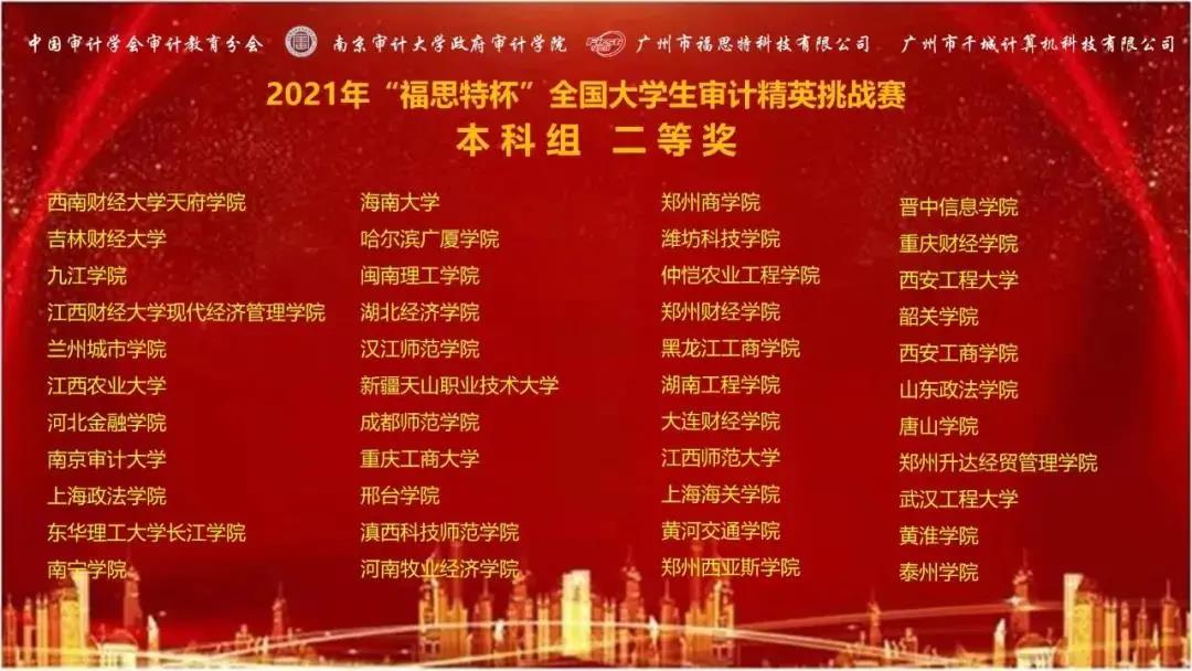 图说:由中国审计学会审计教育分会主办的2021年“福思特杯”全国大学生审计精英挑战赛迎来决赛落下帷幕(线上)。我校参赛队伍从283所高校330支参赛队伍中脱颖而出,获得本科组二等奖的好成绩。