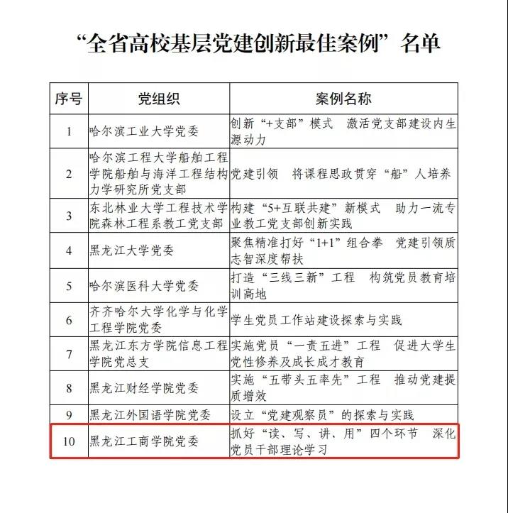 图说:10月,省委教育工委公布了全省高校基层党建创新案例评选结果,本次共评选产生“全省高校基层党建创新最佳案例”10个,“全省高校基层党建创新优秀案例”37个,由我校党委选送的《抓好“读、写、讲、用”四个环节 深化党员干部理论学习》荣获最佳案例。