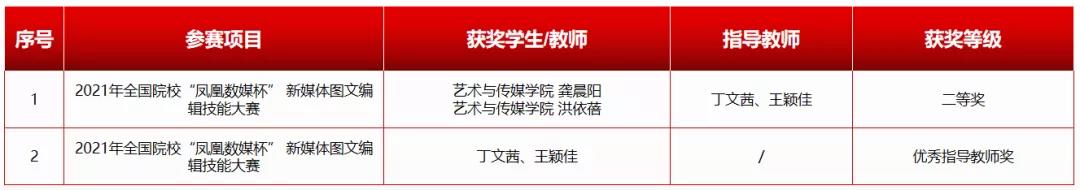 图说:2021年全国院校“凤凰数媒杯”新媒体图文编辑技能大赛获奖名单出炉。艺术与传媒学院学生龚晨阳、洪依蓓从12所院校120余支队伍里脱颖而出,获得二等奖,教师丁文茜、王颖佳获得优秀指导教师奖。