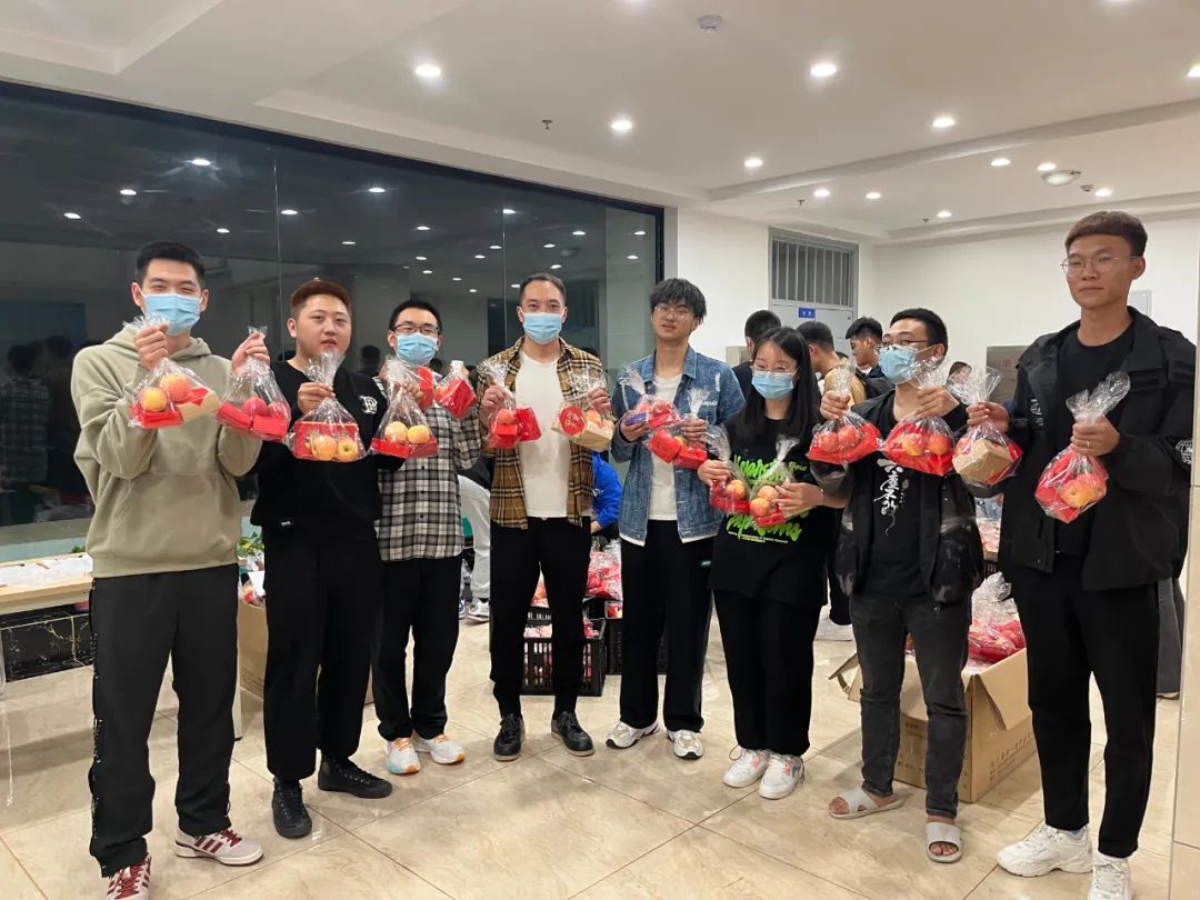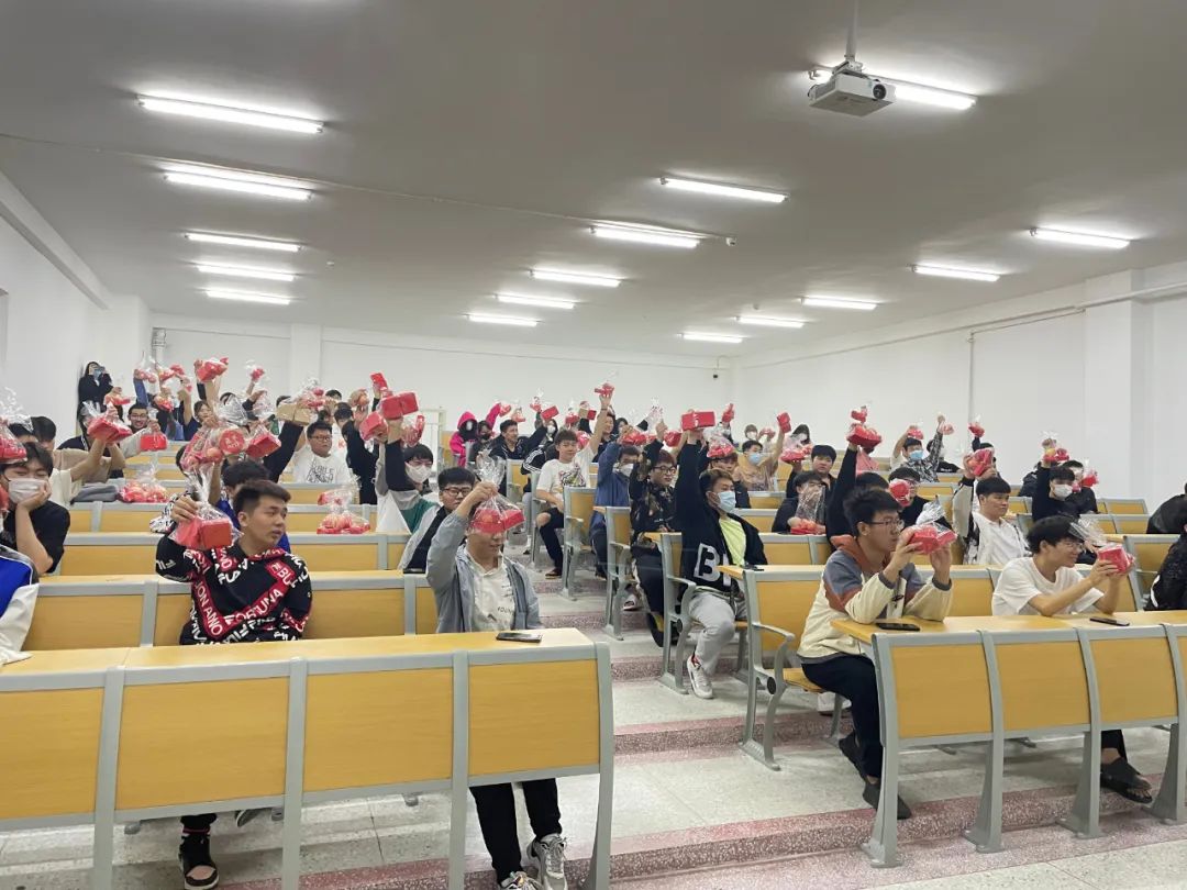 注:信息与机电工程学院联欢会上,同学们手捧学校定制的月饼礼盒和水果。