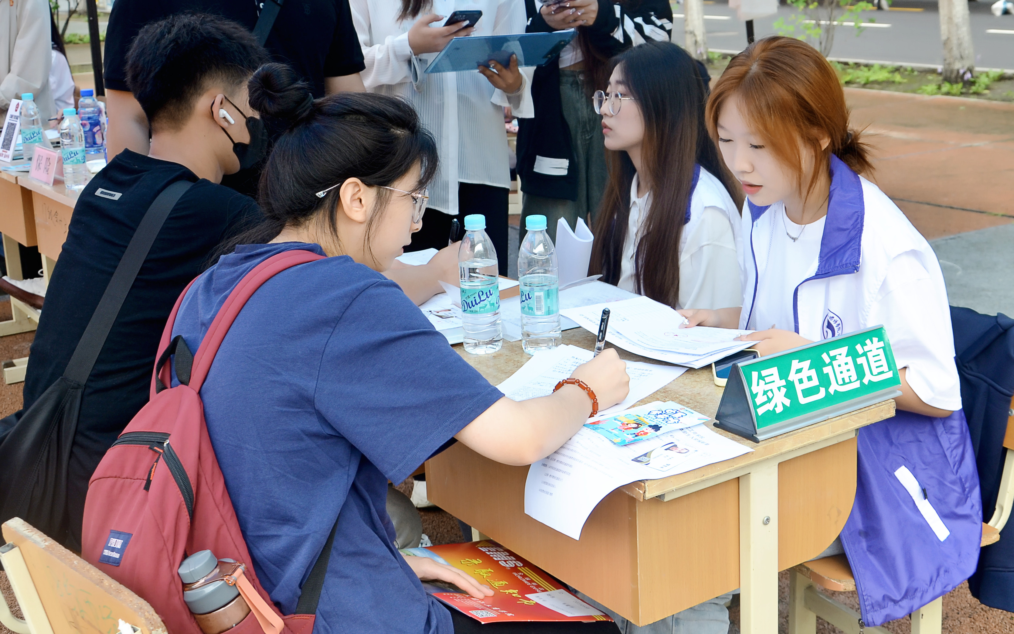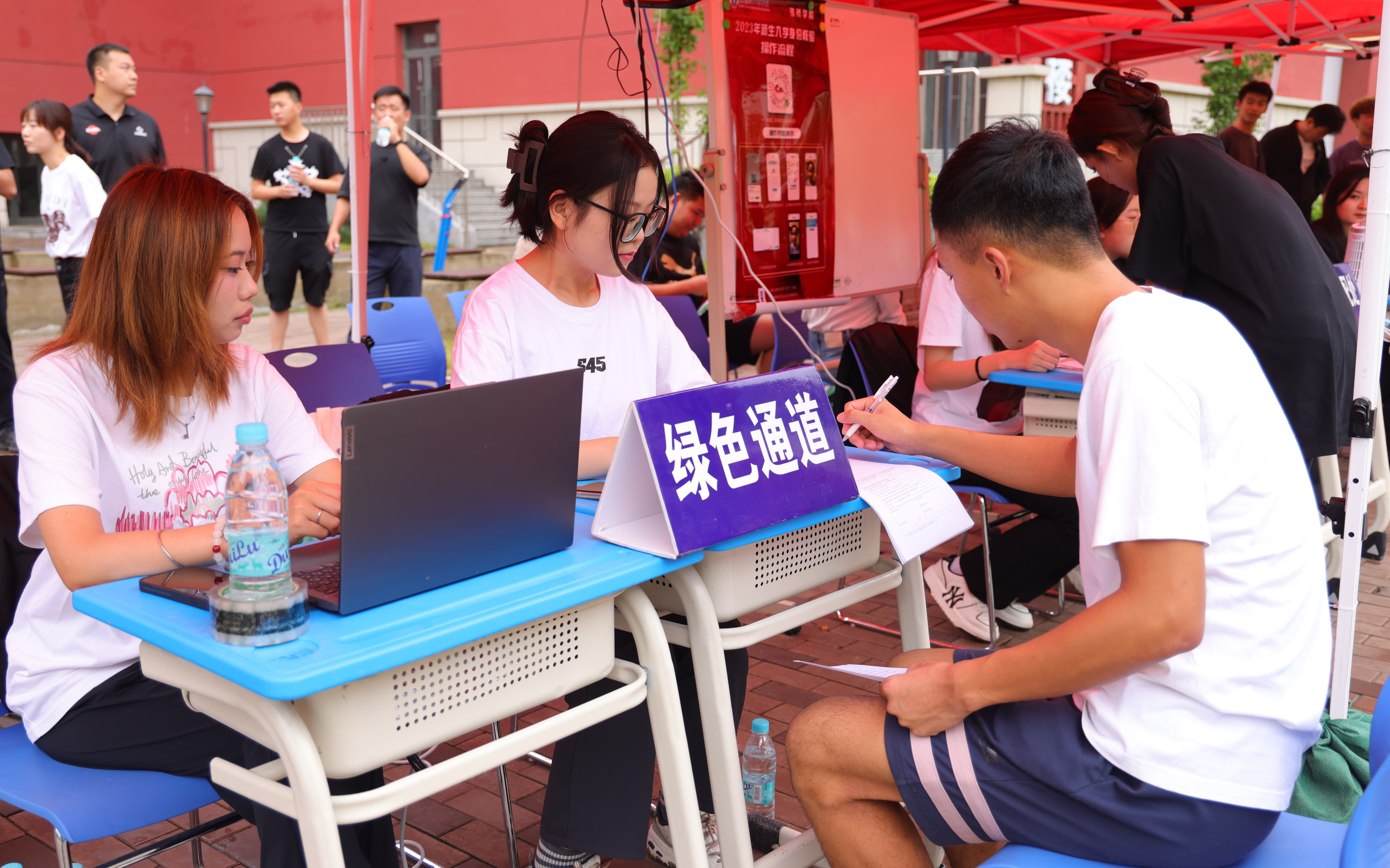 注:志愿者引导新生扫码核验身份