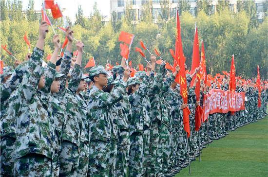 传递仪式后,在2019级同学狄敏和侯新宇的领诵下,师生手持“小我融入大我,青春献给祖国,做新时代的追梦人”的横幅,挥舞小国旗,共同向伟大祖国诚挚告白,师生用坚定的誓言,发出爱国奋斗的新时代青年最强音!
