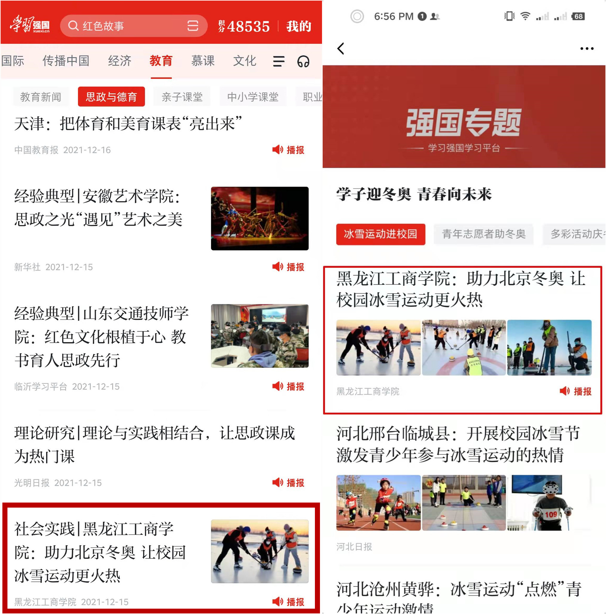 注:学习强国“思政与德育”主栏目和“学子迎冬奥 青春向未来”专题分别进行报道