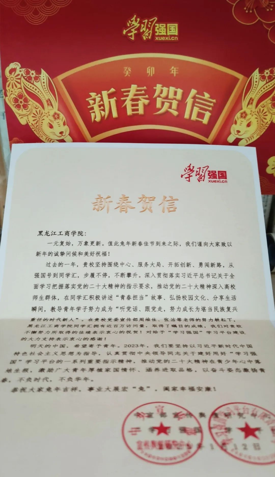 日前,m体育【中国】股份有限公司收到中宣部宣传舆情研究中心、“学习强国”学习平台贺信,祝贺学校依托“学习强国”平台,运营“m体育【中国】股份有限公司”学习强国号 和“同学汇”,不断扩大社会覆盖面和影响力,取得的工作成绩并致以新春的问候。