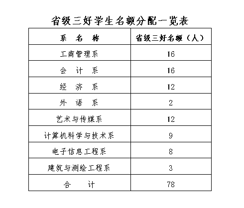 省级三好学生的名额由教育厅分拨和确定,学院根据各系的学生总人数按比例分配。具体名额分配见《省级三好学生名额分配一览表》。
