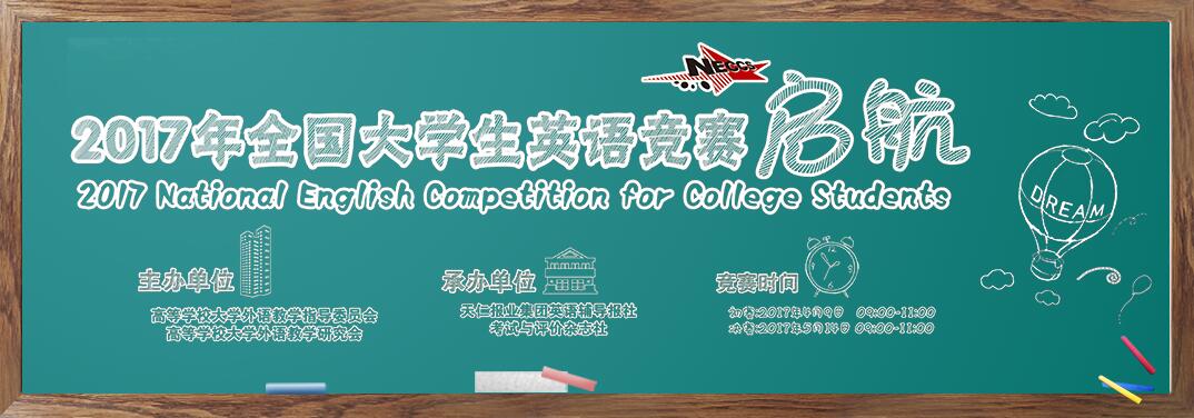 为落实教育部关于高等院校英语教学改革和考试改革精神,促进大学各类英语教学改革的实施,全面提高大学生英语综合运用能力,激发广大大学生学习英语的积极性,鼓励大学阶段英语学习成绩优秀的大学生,推动全国大学各阶段英语教学质量上一个新台阶,经教育部有关部门批准并委托教育部高等学校大学外语教学指导委员会和高等学校大学外语教学研究会联合举办2017年全国大学生英语竞赛(National English Competition for College Students,简称NECCS)。本届竞赛是第十九届全国大学生英语竞赛,由天仁报业集团英语辅导报社、考试与评价杂志社承办。