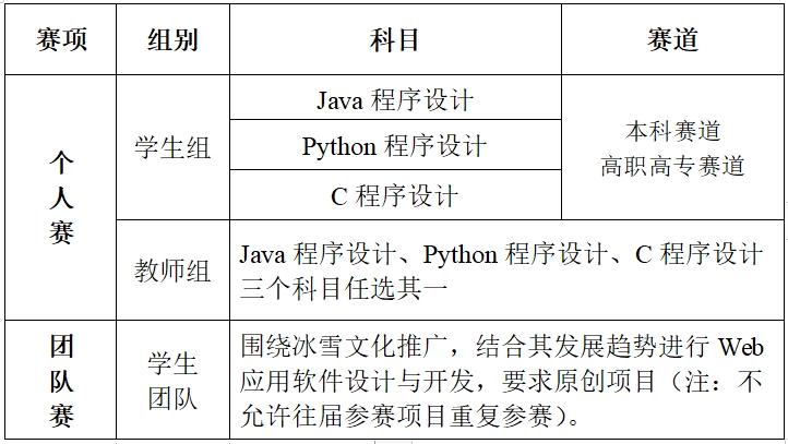 大赛分设学生组和教师组;学生组科目为Java程序设计、Python程序设计和C程序设计,并设本科赛道和高职高专赛道;教师组科目为Java程序设计、Python程序设计和C程序设计。每位师生只能参与1项比赛科目。