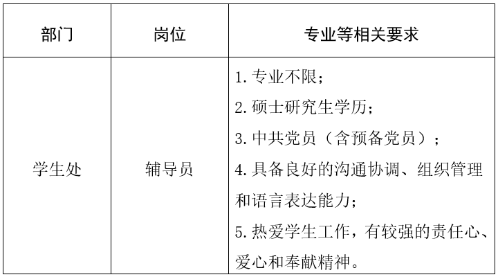为进一步加强学生思想政治教育和日常管理服务工作,打造高素质专业化辅导员队伍,发挥辅导员在立德树人中的关键作用,助力学生成长成才,现面向社会公开招聘辅导员岗位人才,诚邀有志于学生工作的优秀人才加入我校。