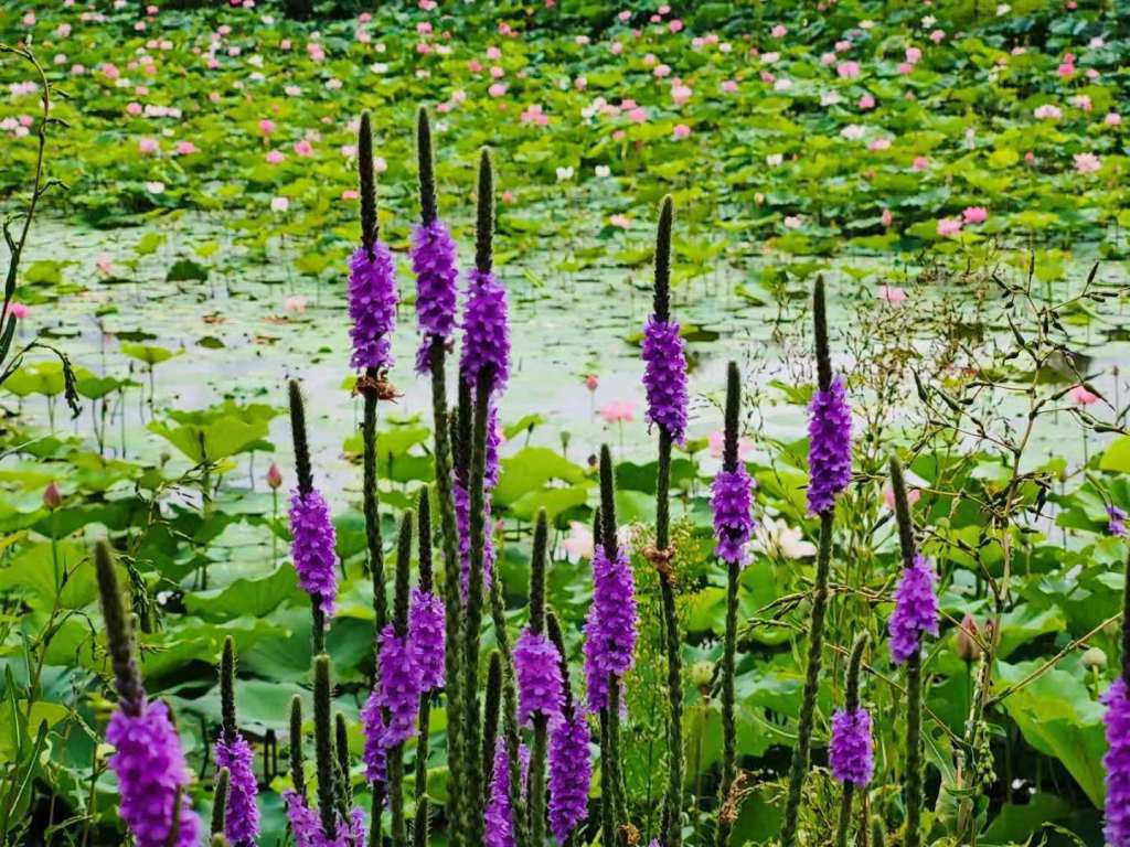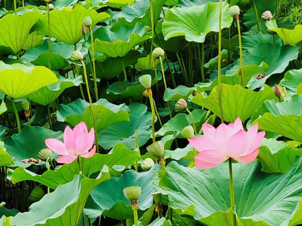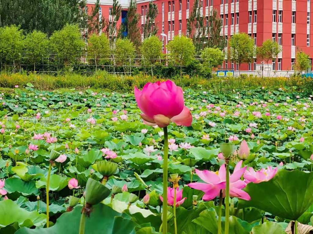夏日荷塘,荷花尽绽放,宛若一幅雅致清新的水墨画。远处兴隆湖水色苍茫,浮云片片,水榭风微;近处荷叶田田,莲蓬悄然出水,青碧喜人。楼前有花,花后有湖,水汽清澄,一幅独家的校园画卷悄然铺开,自有妙处悠然会意。