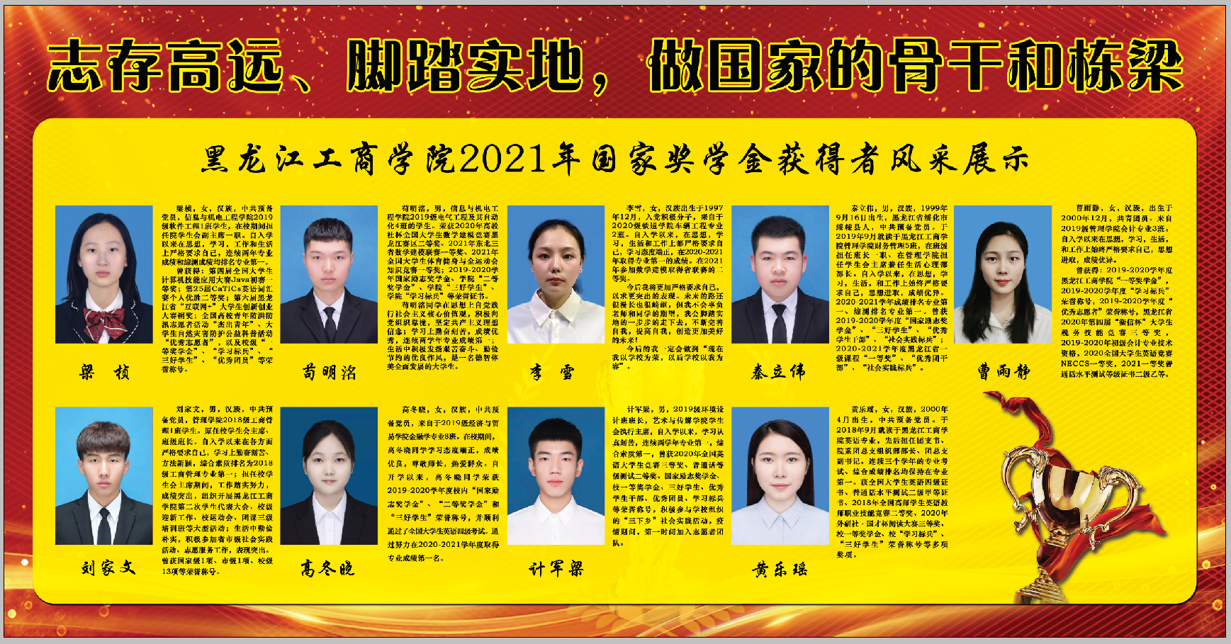 2020-2021学年专业成绩排名第一、综测排名专业第一。曾获2019-2020学年度国家励志奖学金,曾获“三好学生”、“优秀学生干部”、“社会实践标兵”荣誉称号;还曾获2020-2021学年度黑龙江省一级课程一等奖,以及“优秀团干部”、“社会实践标兵”等荣誉称号。