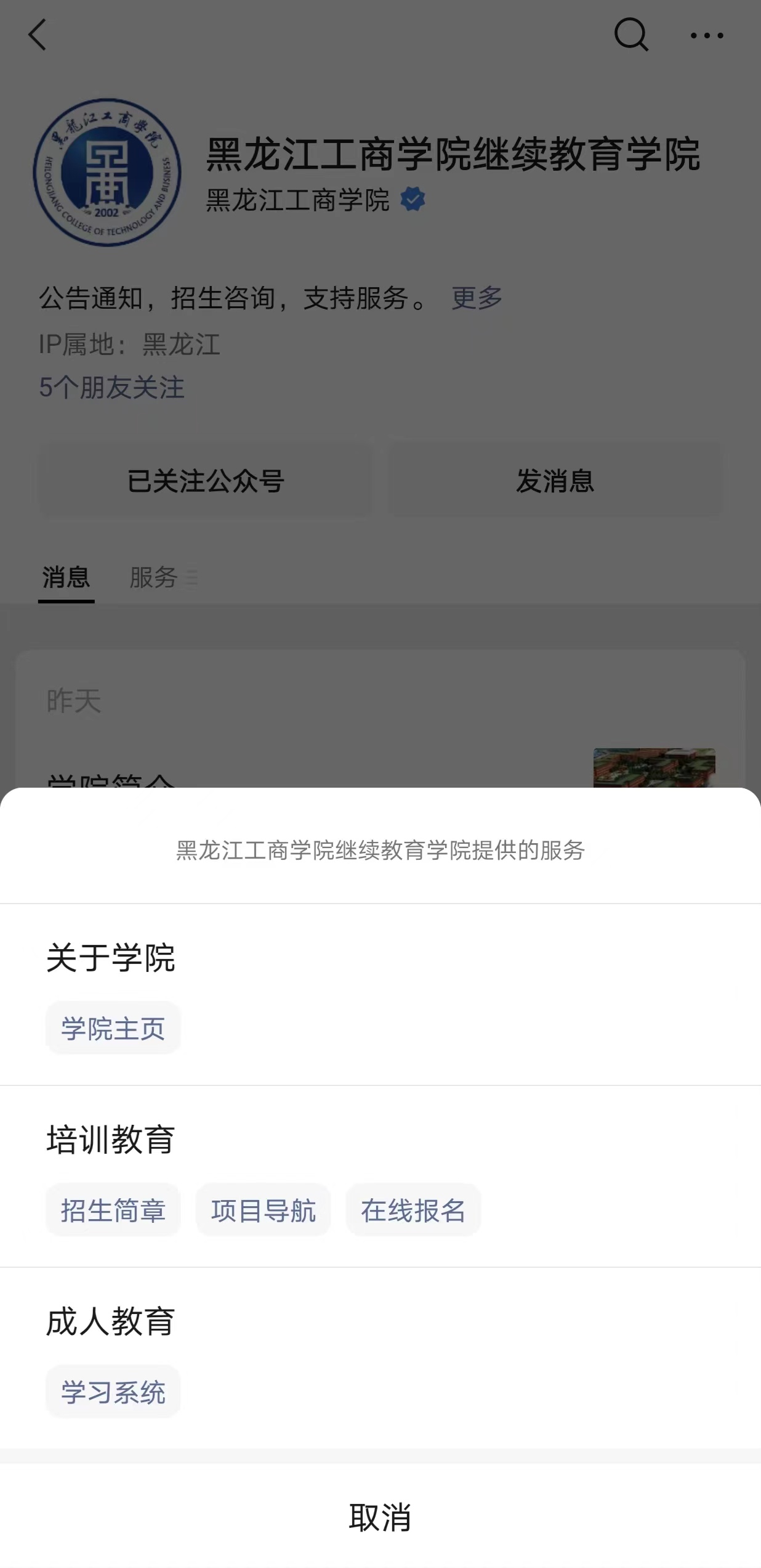 继续教育学院官方微信平台设有“关于学院”“培训教育”“成人教育”三大栏目并坚持定期推送,全面展示办学成绩、推荐项目介绍、发布招生信息及报考资讯。同时,为方便师生和社会人士咨询报名,更好的开展服务,官微还设置了在线报名功能,只需点击“在线报名”填写姓名、专业、报考证书名称,即可实现“一键报名”。