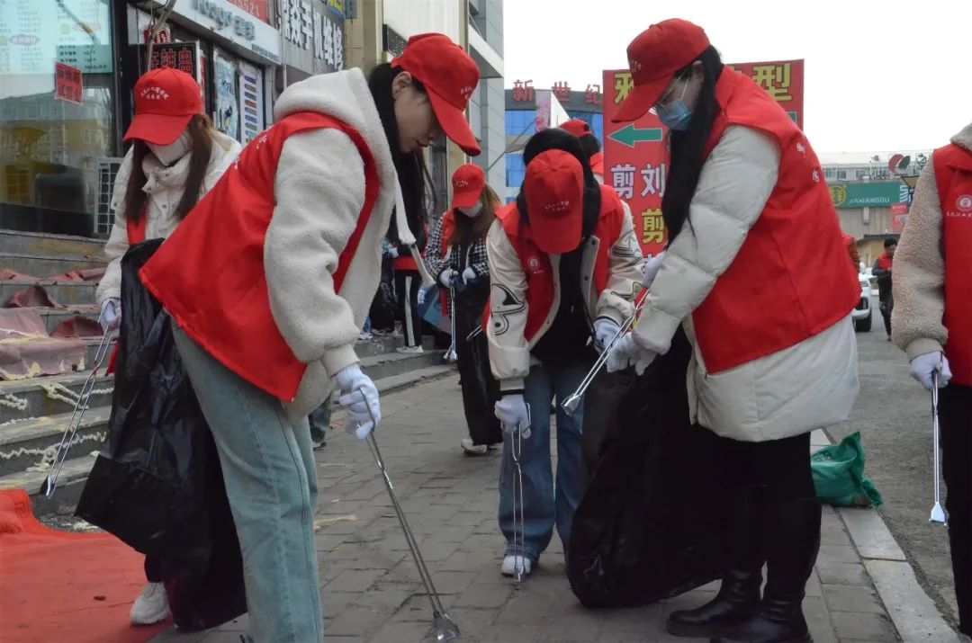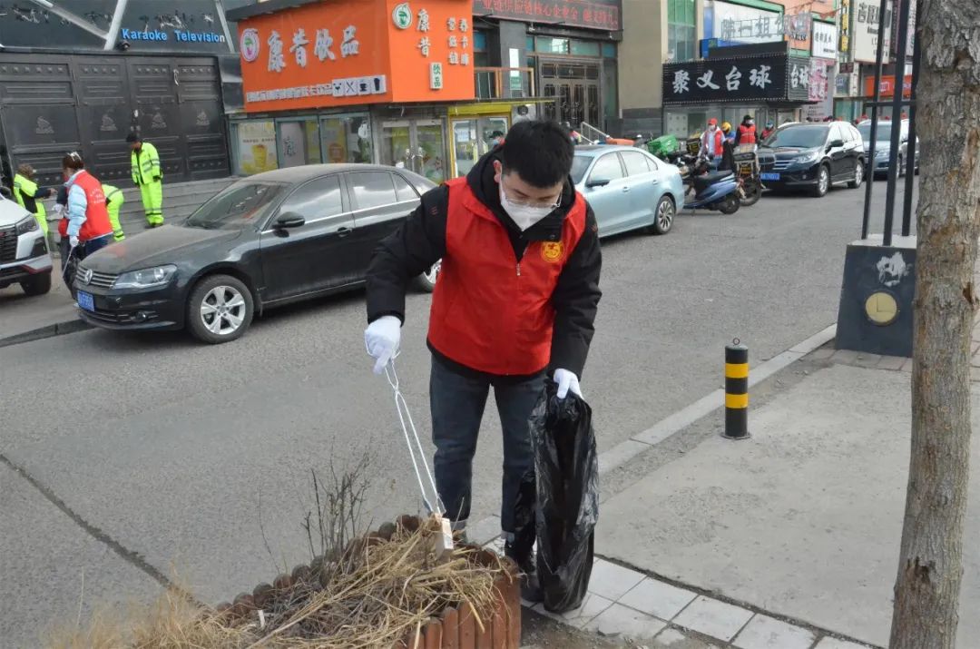 在垃圾分类主题广场,志愿者们身穿马甲,手持垃圾袋和火钳,沿小区绿化带拾捡草坪和小道上的废弃物、生活垃圾、纸巾、果皮、食品袋、烟头等各种垃圾。随后志愿服务队伍来到学伟社区,用铁铲、塑料袋等清洁工具,对社区电线杆、单元门、楼梯过道、楼房外墙等公共设施上贴的各类小广告进行清理。
