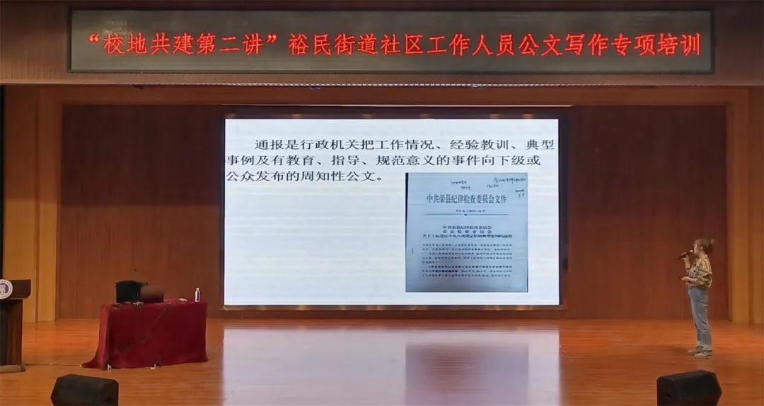 近日,校团委举行“校地共建”裕民街道社区工作人员公文写作专项培训,深化校地共建,实现优势互补、资源共享、双向共赢、共同发展的新模式,充分发挥我校教学实训基地和技术资源优势,为社区提供多样性服务。培训会由基础教学部教师薛淑敏主讲,校团委韩龙主持培训会。
