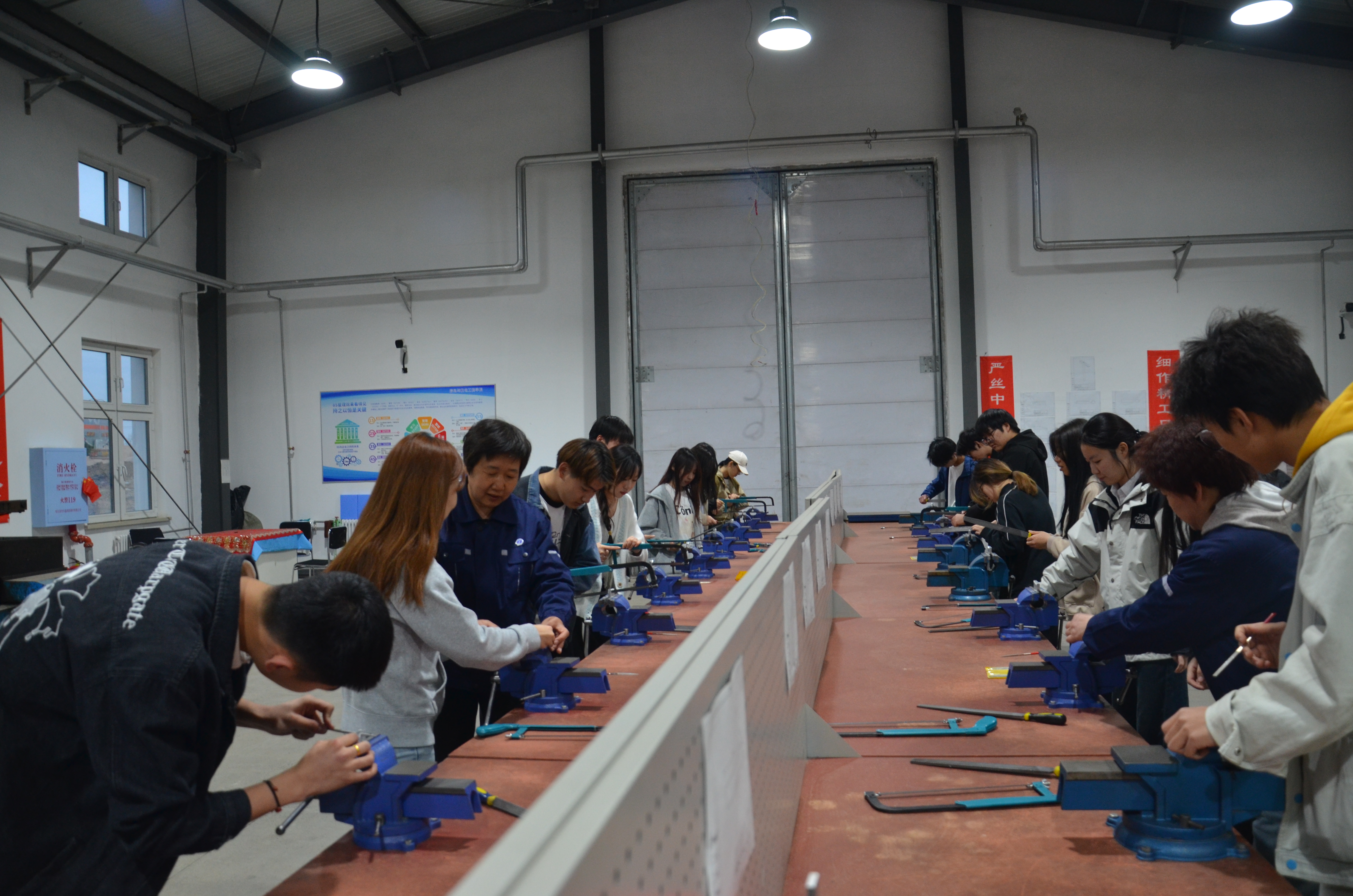 比赛现场,选手们通过切、割、磨、钻、锯、挫等手法,熟练地完成实操,展示出过硬的专业技能。在专业老师的讲解下,选手门详细了解零件制作流程,各种量具的操作测量方法。