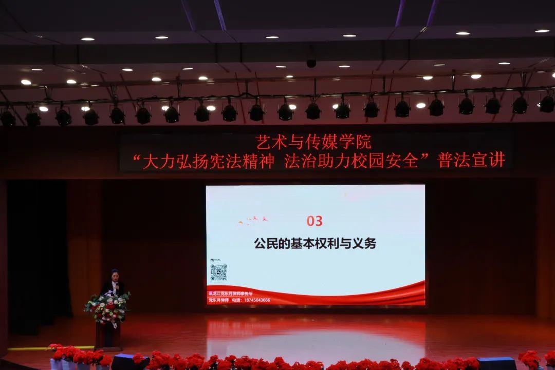 普法宣传周期间,艺术与传媒学院举办“大力弘扬宪法精神 法治助力校园安全”普法宣讲活动,邀请到黑龙江党东月律师事务所律师党东月作普法宣讲。党委副书记、副校长张幸刚,学生处处长、团委书记张玉娜,副院长管营,哈尔滨新区司法局、松北区委政法委、松北区人民法院、裕民街道办事处、学院路派出所、学院路司法所、金泰社区相关领导出席活动。