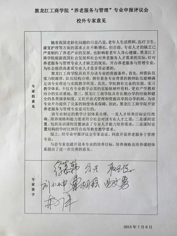 根据《关于2015年度普通高等学校本科专业设置工作有关问题的说明》(教高司函[2015]24号)和《关于做好2015年度省属普通高校本科专业设置工作的通知》(黑教高函[2015]223号)规定,经专家评议通过,我院拟申报“养老服务与管理”专业,现将相关材料在网上进行公示。