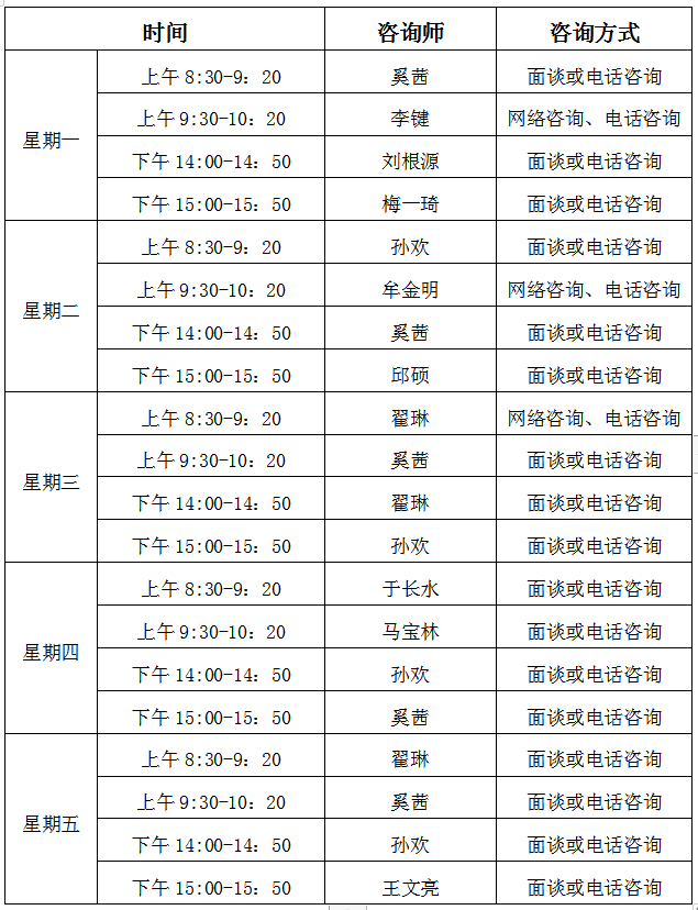 服务方式:暂为线上咨询,待学校疫情防控政策调整后,适时调整为线下咨询,咨询地点为第二教学楼105室。