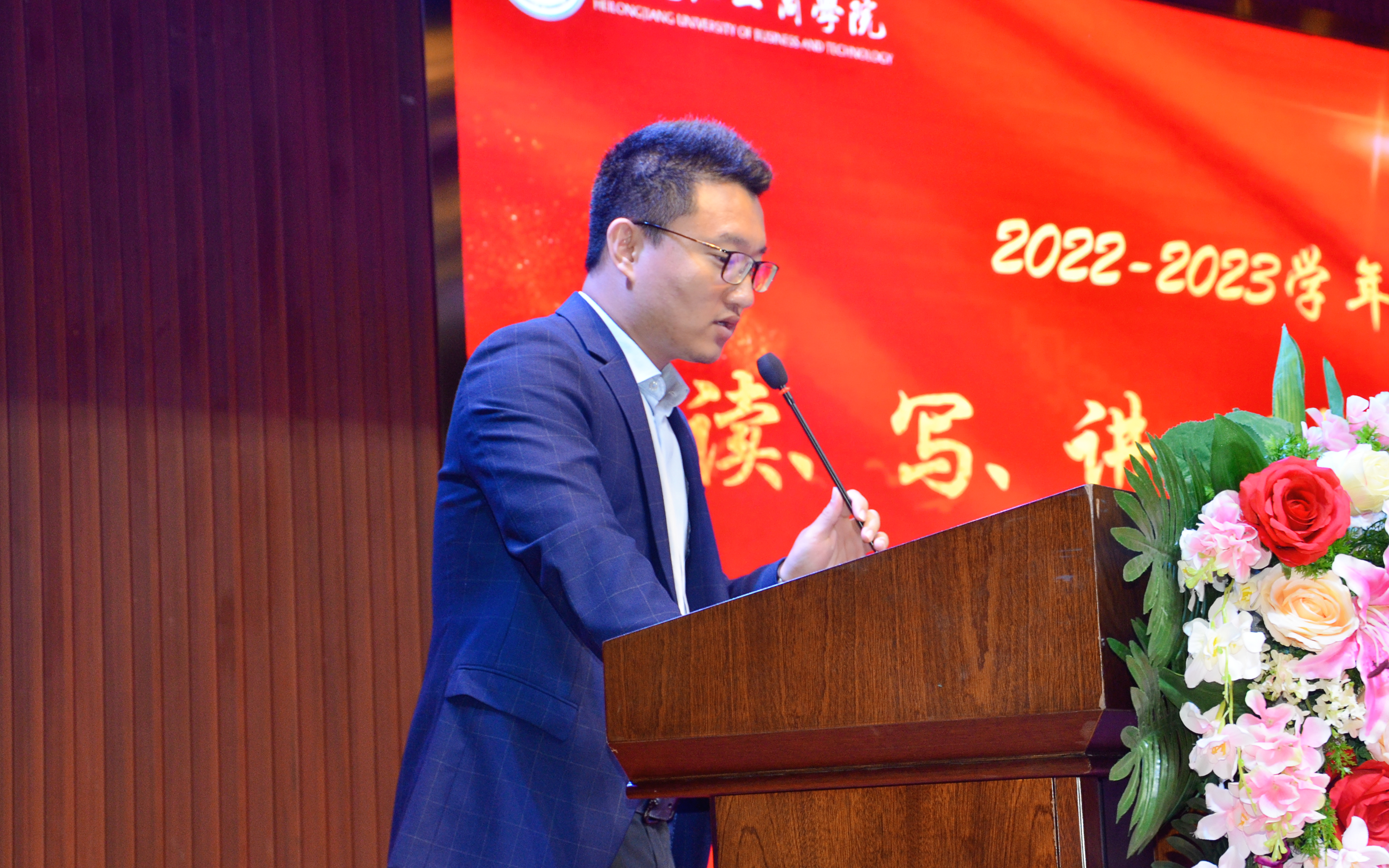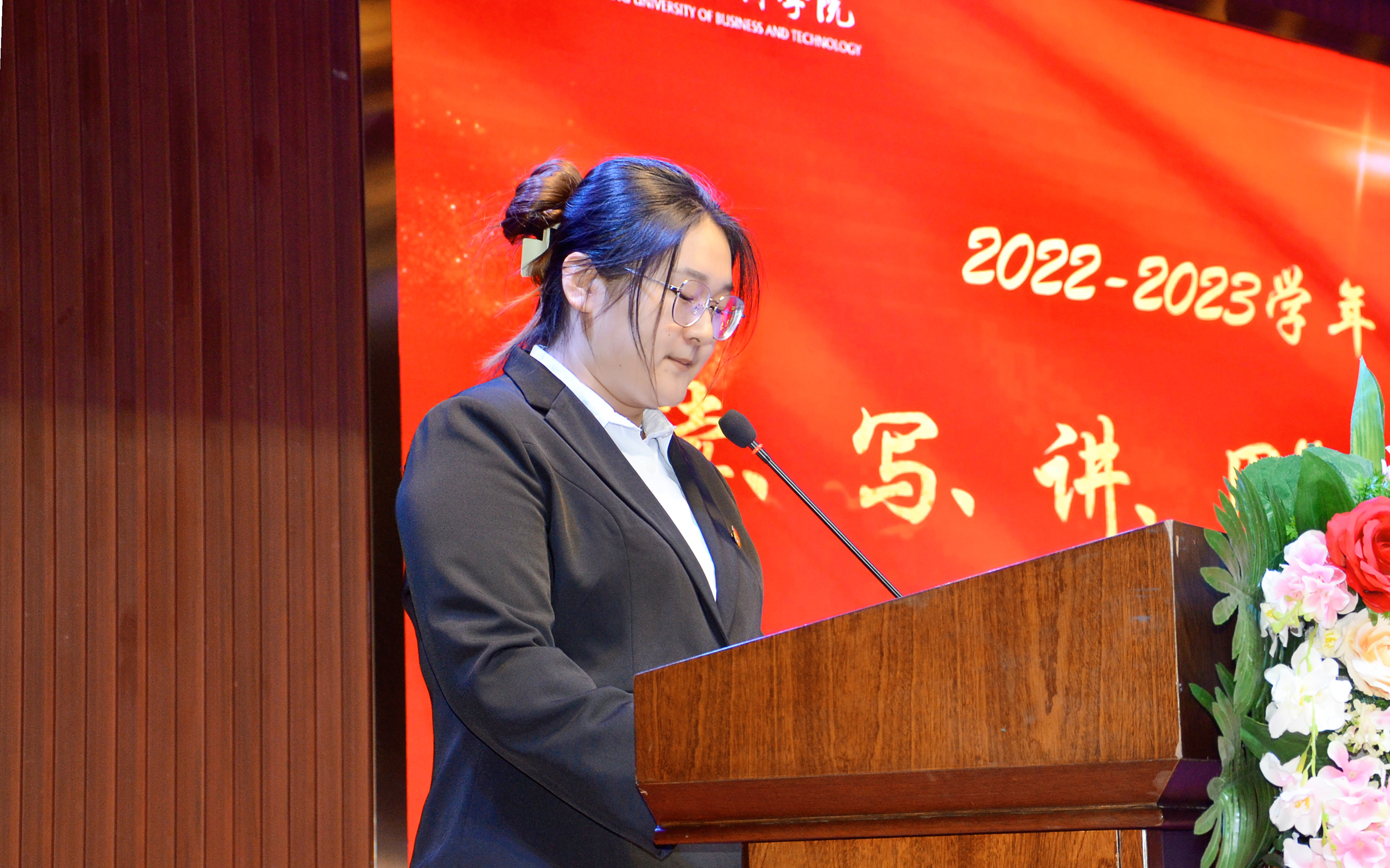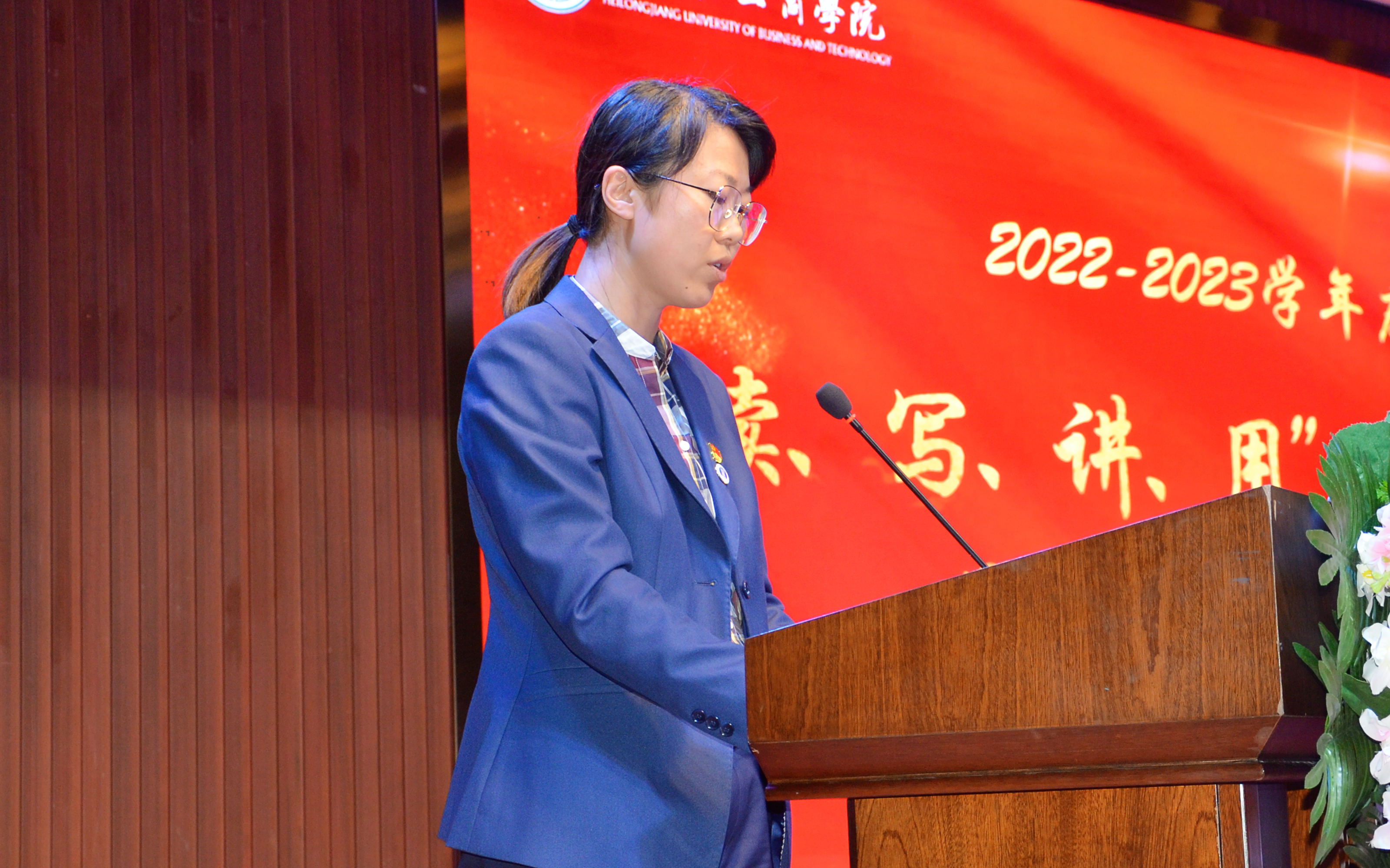 表彰会上,获得“读、写、讲、用”优秀诵读者、优秀书画作品、优秀学习心得、优秀指导教师、社会实践标兵等共10个奖项的师生代表上台领奖。2021级英语专业卢杨杨、商学院团总支书记王宁、艺术与传媒学院党总支副书记董迪分别作经验交流发言。