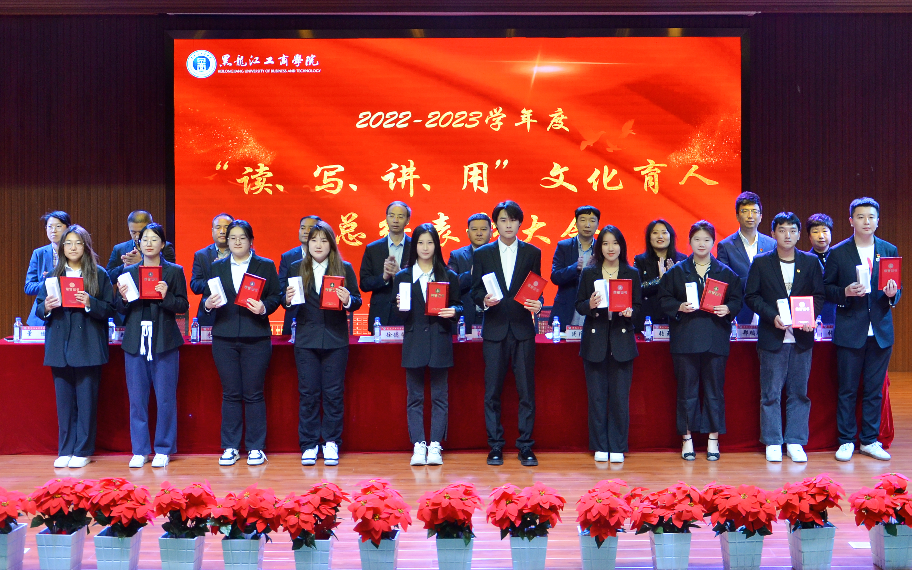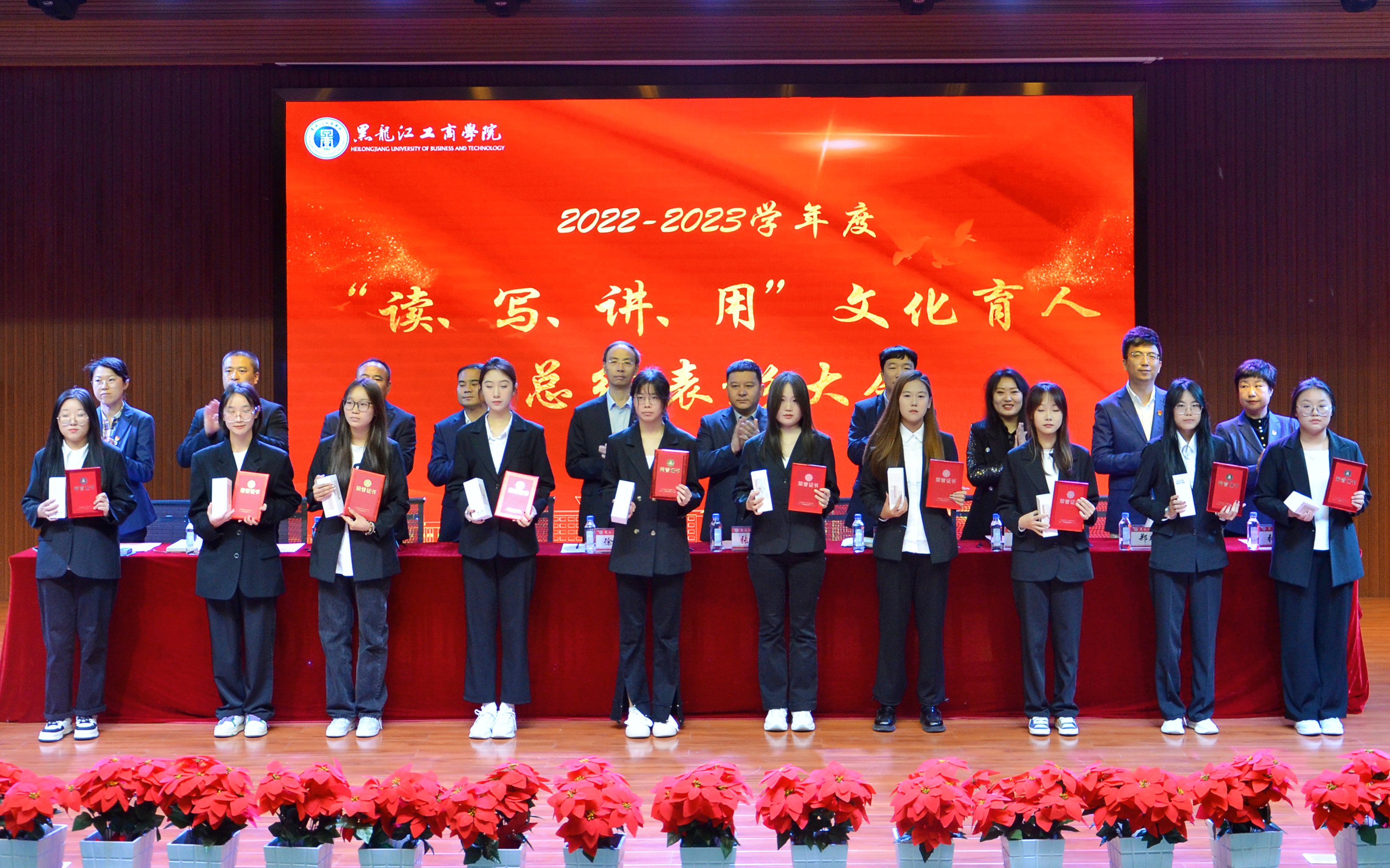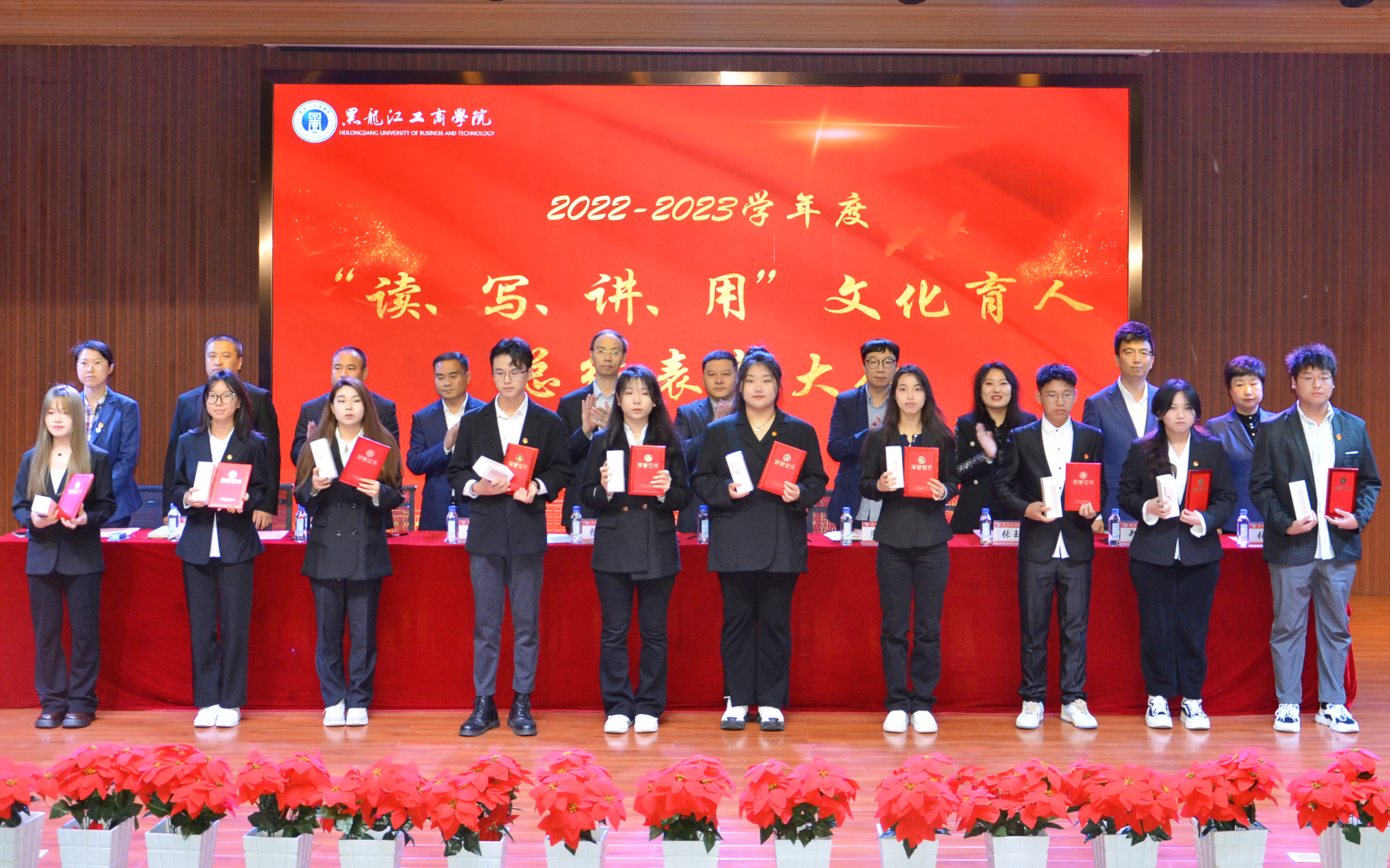 表彰会上,获得“读、写、讲、用”优秀诵读者、优秀书画作品、优秀学习心得、优秀指导教师、社会实践标兵等共10个奖项的师生代表上台领奖。2021级英语专业卢杨杨、商学院团总支书记王宁、艺术与传媒学院党总支副书记董迪分别作经验交流发言。