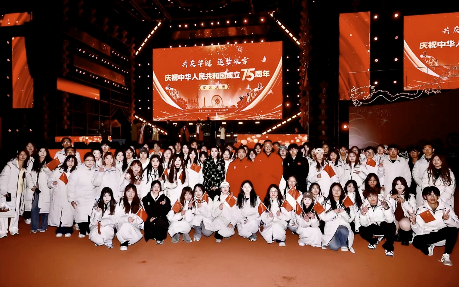 奋斗是青年献给祖国最嘹亮的赞歌。10月1日,由哈尔滨市文化广电和旅游局、共青团哈尔滨市委员会、马迭尔文化旅游投资集团主办,哈尔滨广播电视台、哈尔滨冰雪大世界承办的“共庆华诞 逐梦冰雪”庆祝中华人民共和国成立75周年文艺演出在哈尔滨冰雪大世界园区举行。我校100名师生志愿者倾情服务本次演出,以奋斗礼赞祖国,用奉献共谱华章,传递了浓浓爱国之情,保障了演出活动的成功举办。