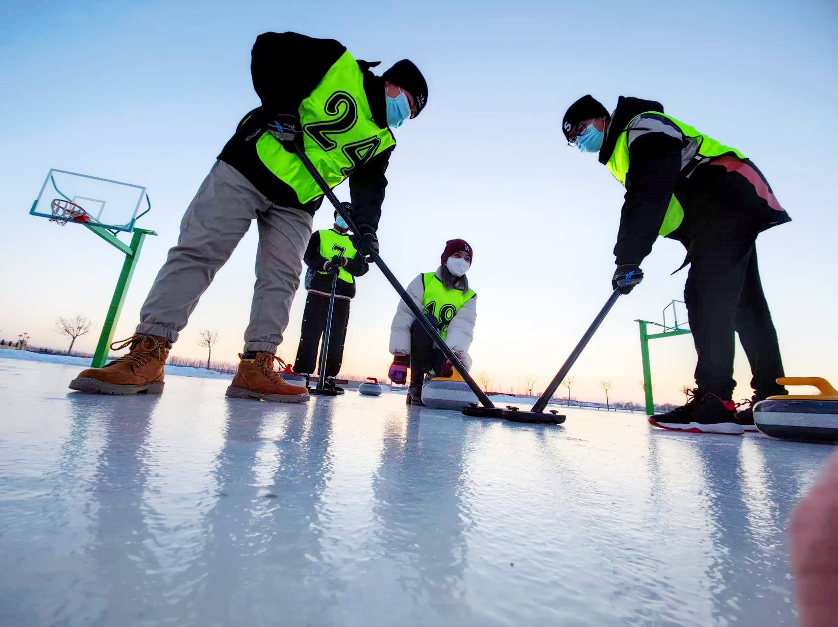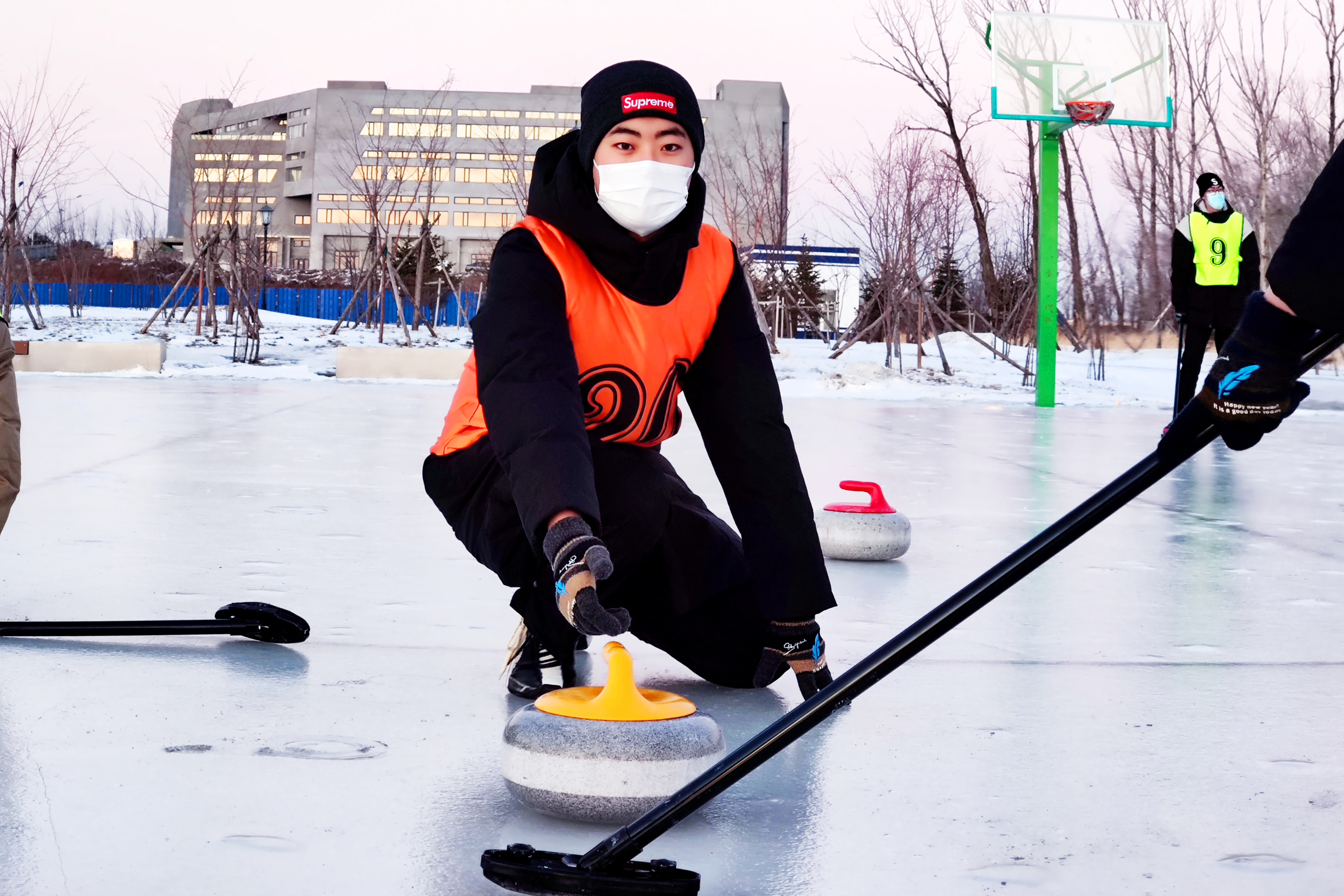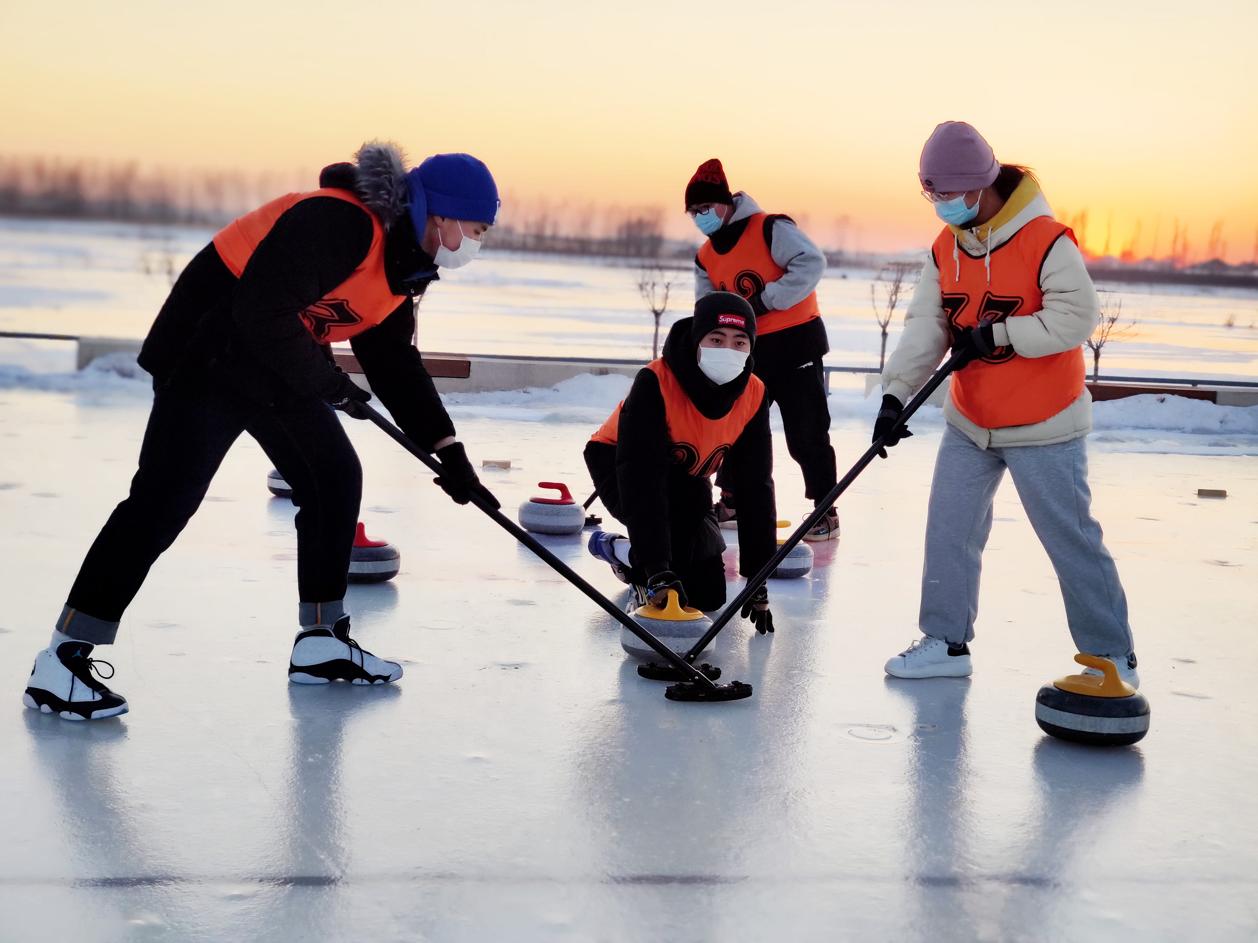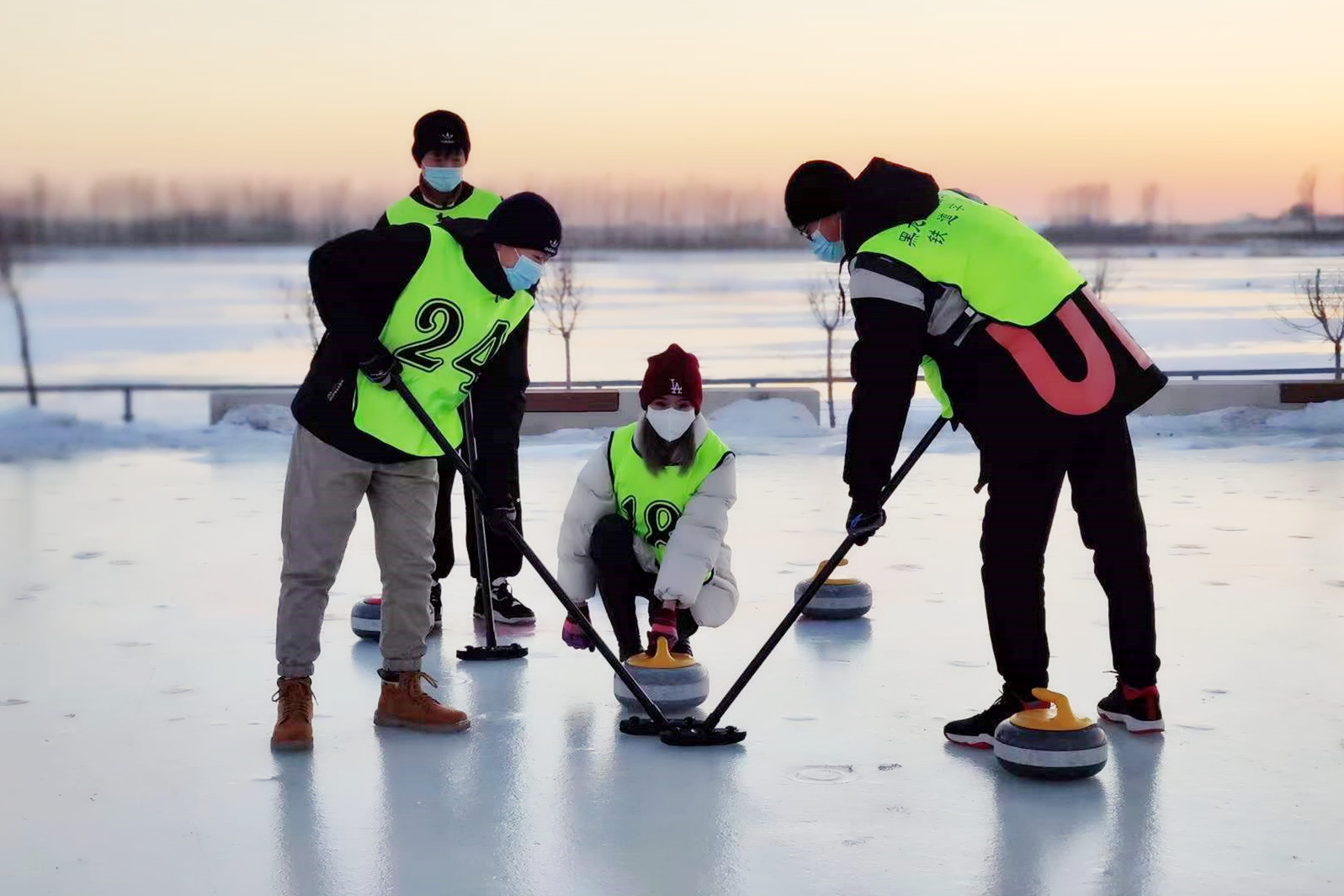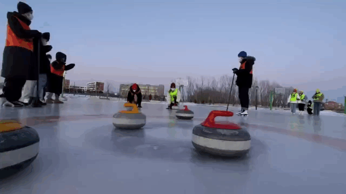 注:舒鑫(中间掷冰壶者)参加冰壶运动