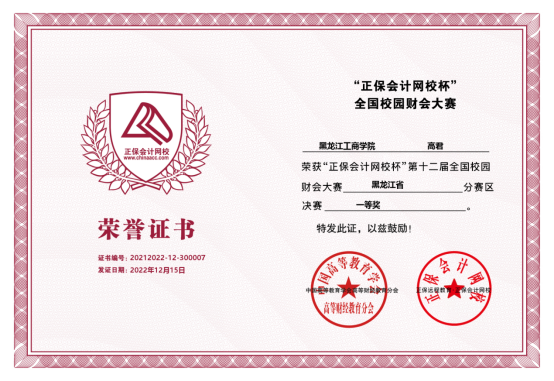 注:在“正保会计网校杯”全国校园财会大赛喜获一等奖