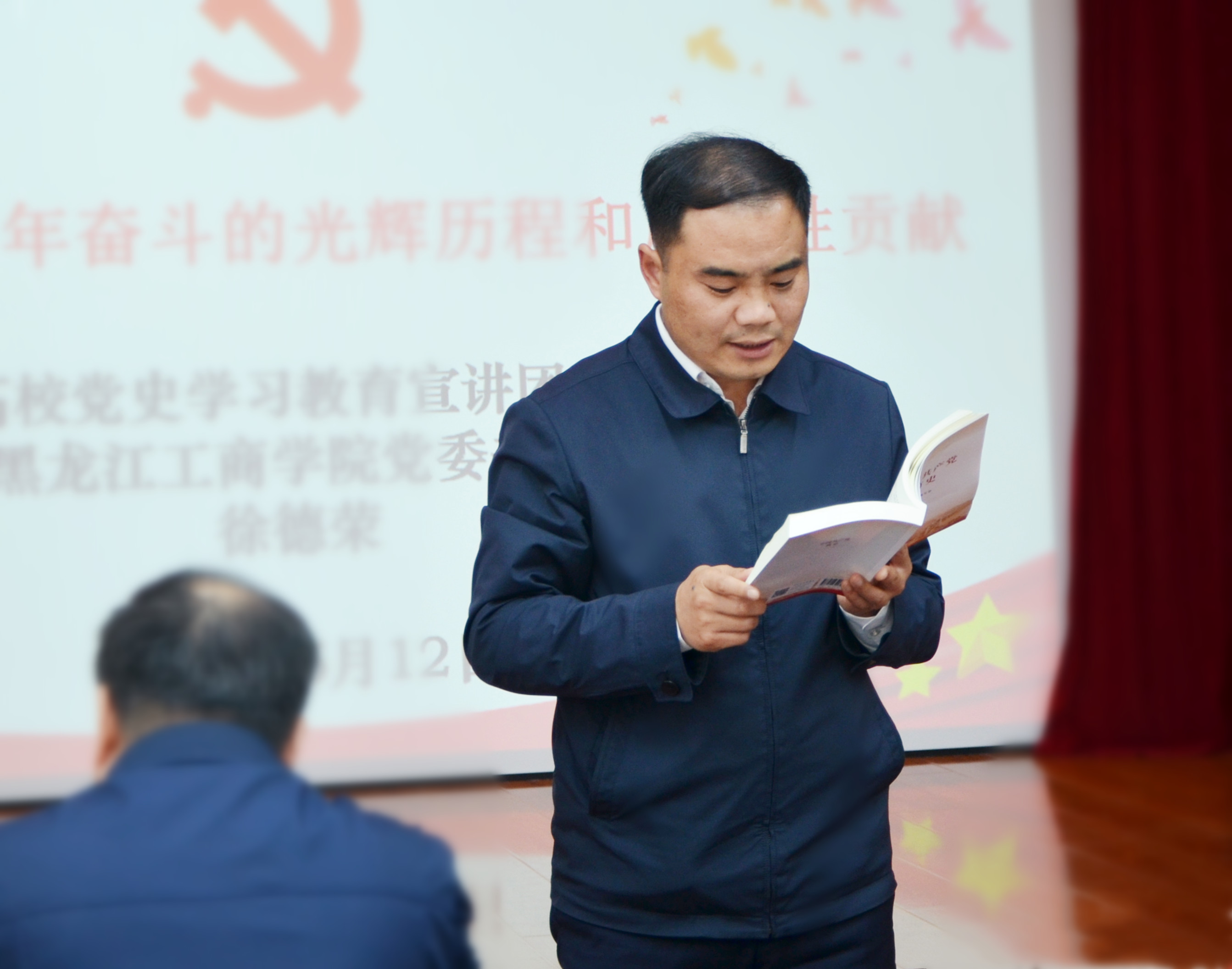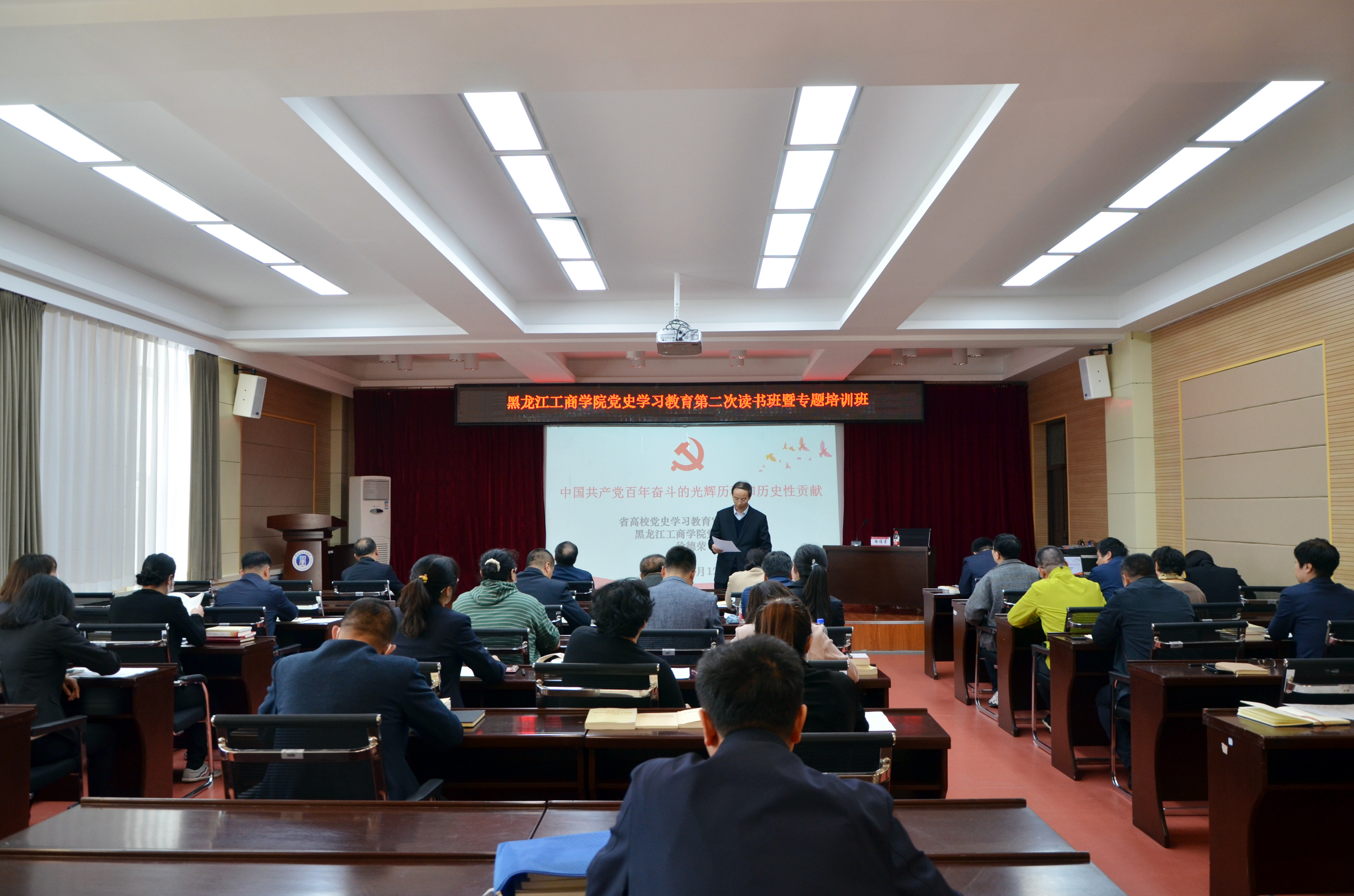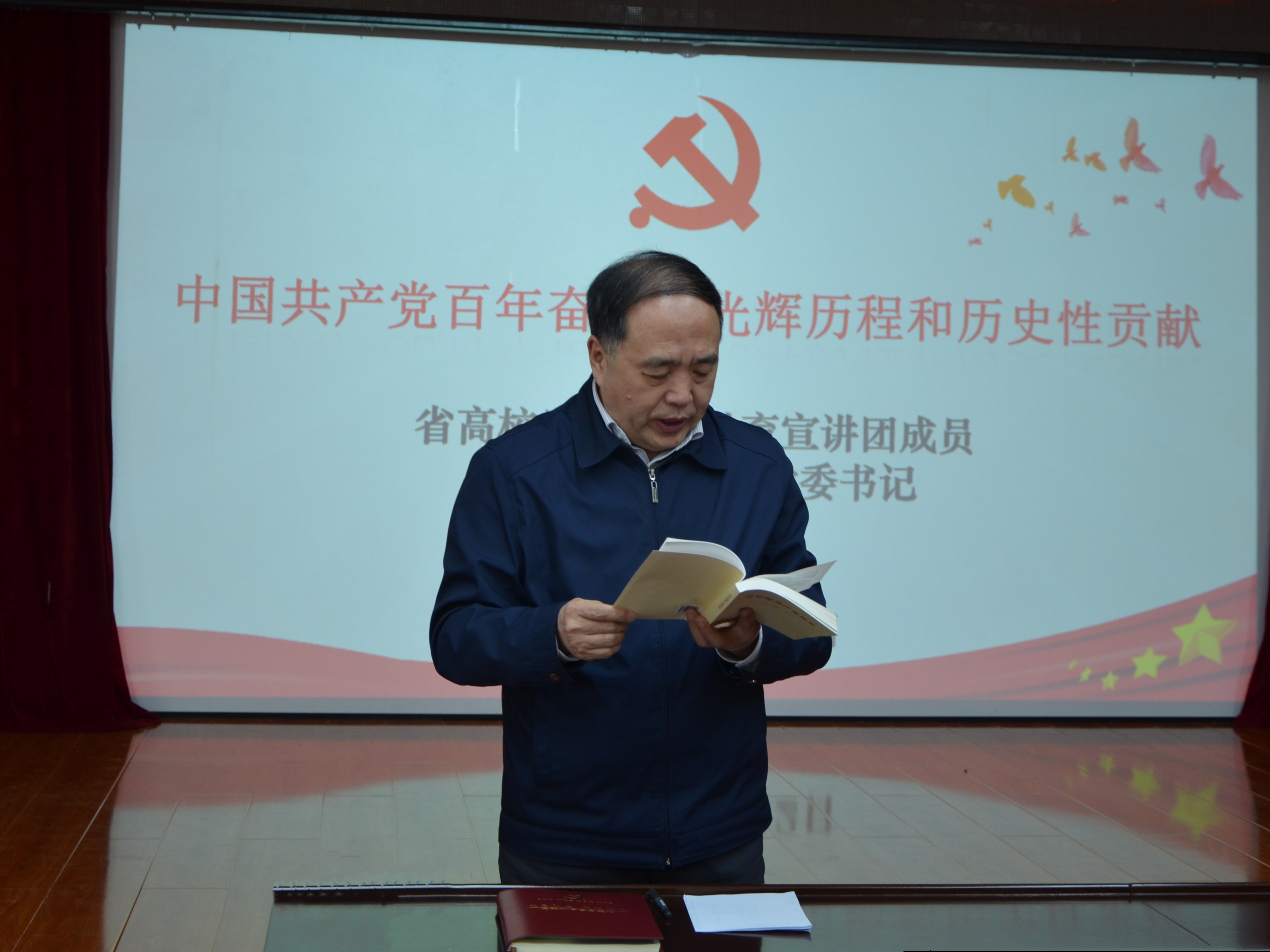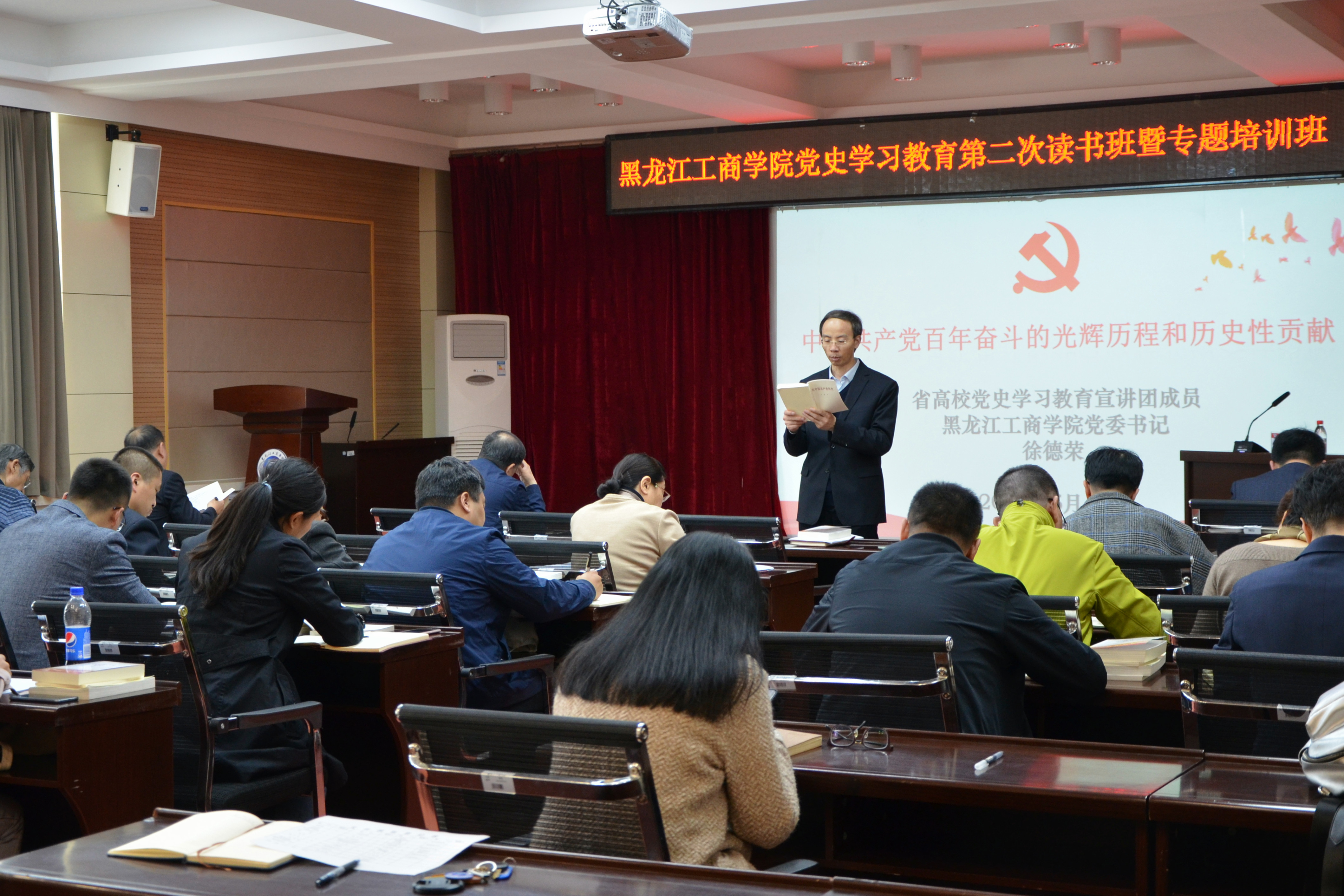 徐德荣以“中国共产党百年奋斗的光辉历程和历史性贡献”为题,重点围绕经过顽强奋斗,党团结带领人民实现了中华民族从东亚病夫到站起来的伟大飞跃;经过顽强奋斗,党团结带领人民实现了中华民族从站起来到富起来的伟大飞跃;经过顽强奋斗,党团结带领人民迎来了中华民族从站起来、富起来到强起来的伟大飞跃;中国特色社会主义是党和人民奋斗、创造、积累的根本成就等四个方面进行了深刻阐述。