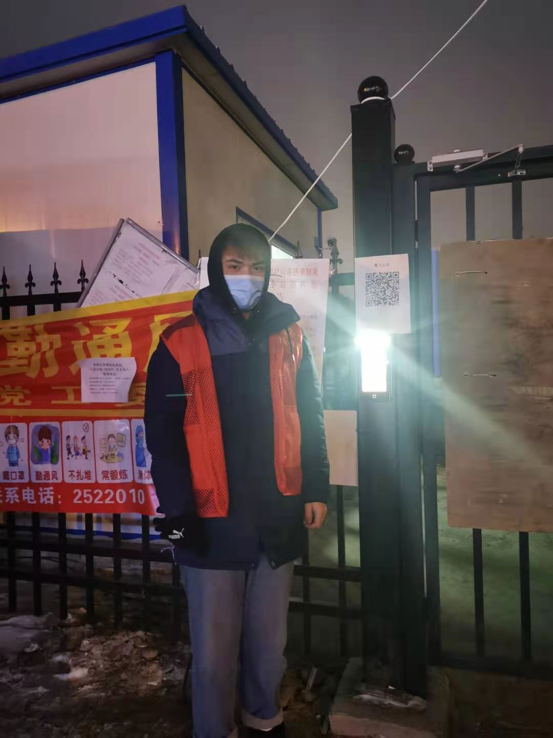 作为一名在校期间表现优异的青年大学生、一名团学干部,在防控疫情严峻的形势下,郭一鸣积极响应号召,主动在社区报名,成为了一名抗疫志愿者,主要负责登记出入小区的人员,督促进入小区的人员扫描健康码,保证小区人员的安全进出。不在其位,不知其苦。从早上八点开始到晚上十点结束,他始终坚守在自己的岗位,没有丝毫的松懈,不论是面对天气的严寒还是工作的劳累,他都引以为傲。