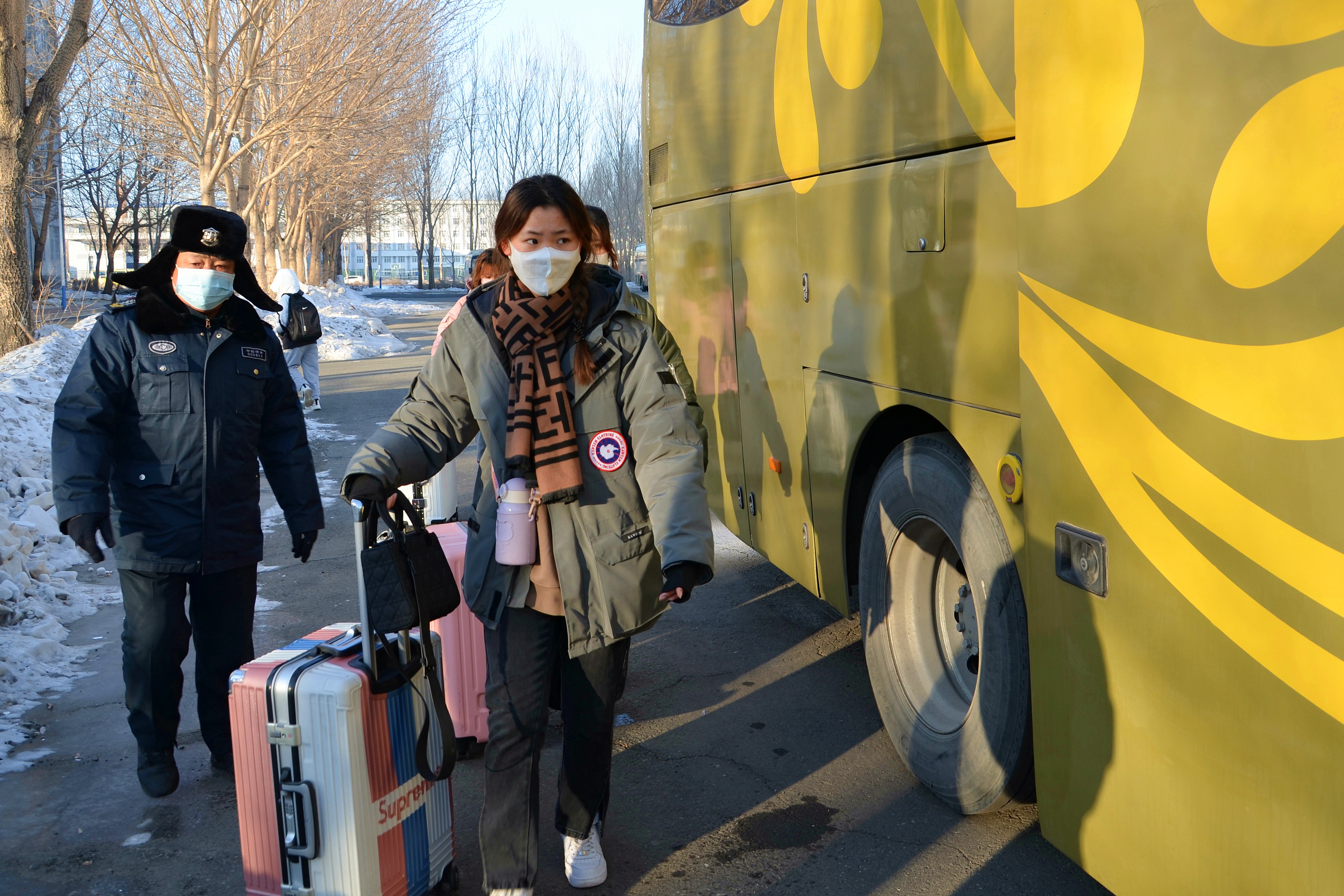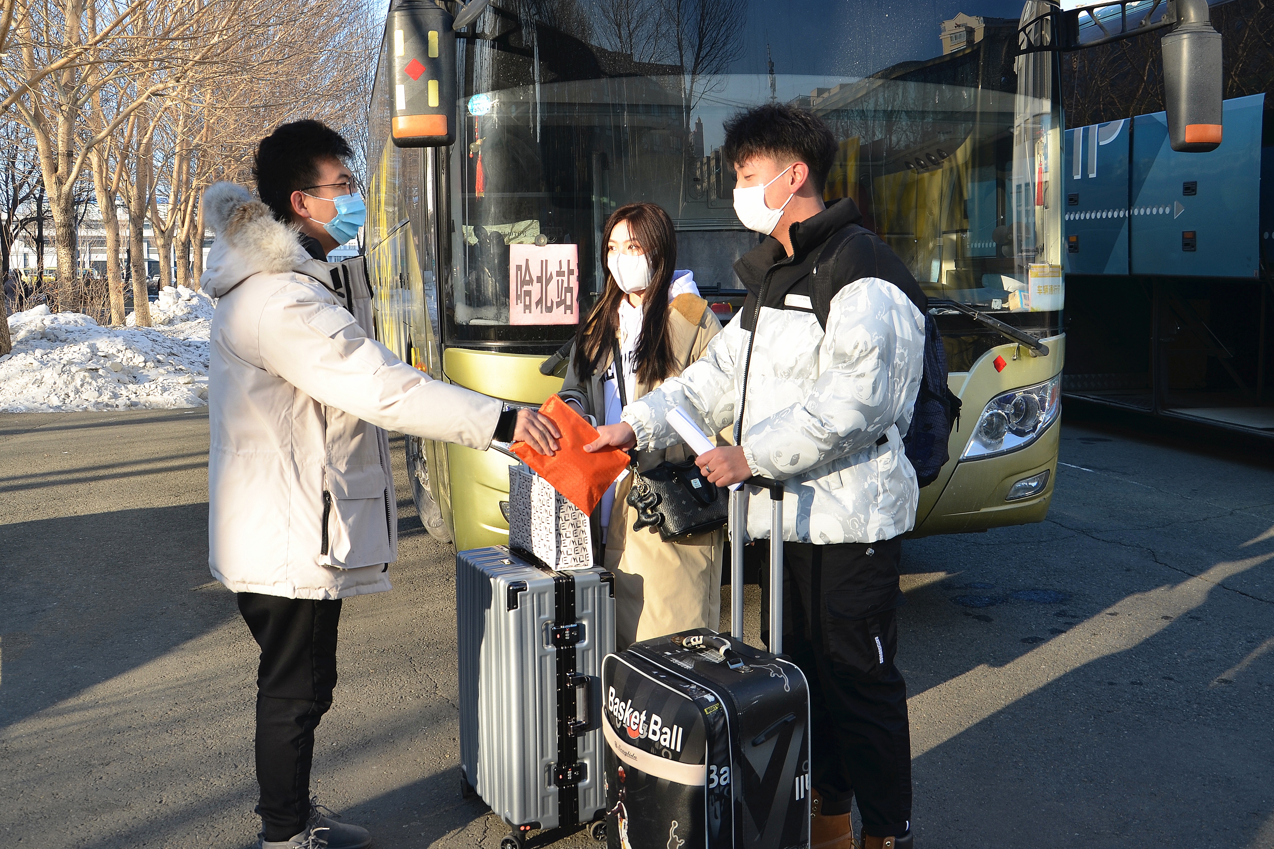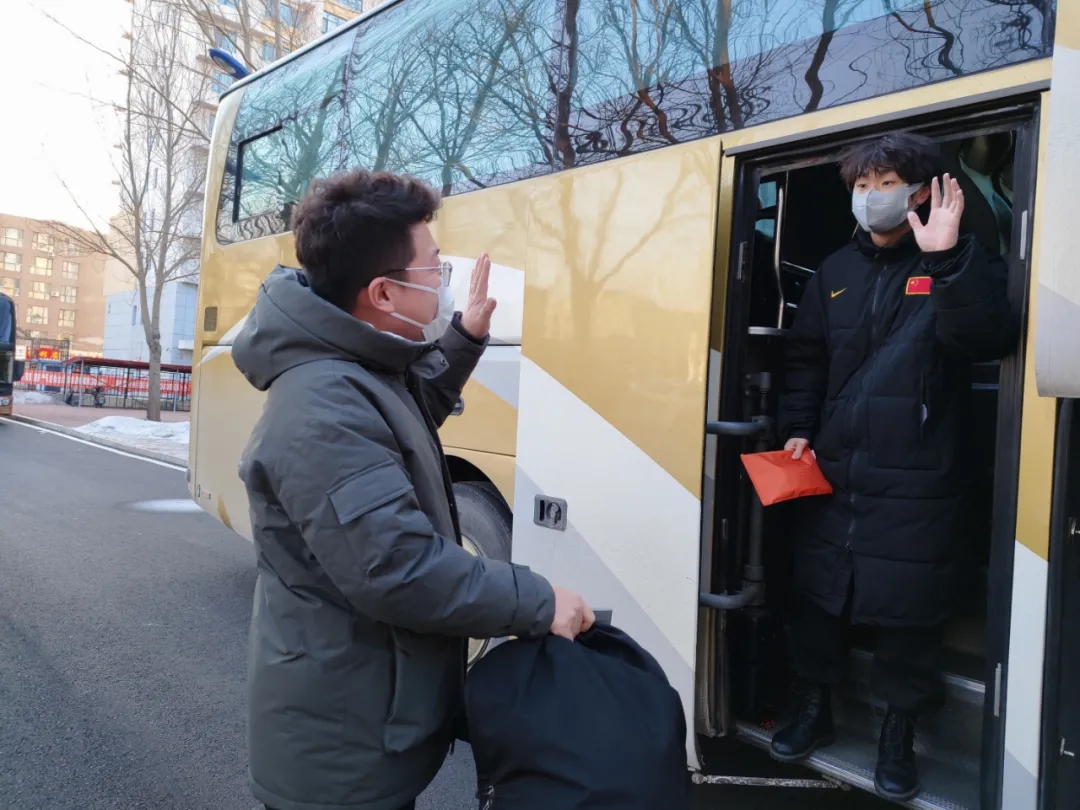 注:常务副校长王利民叮嘱同学们做好自我防护,有问题及时和学校沟通 注:2021级金融学的郭正南上车时与辅导员王文亮互道祝福