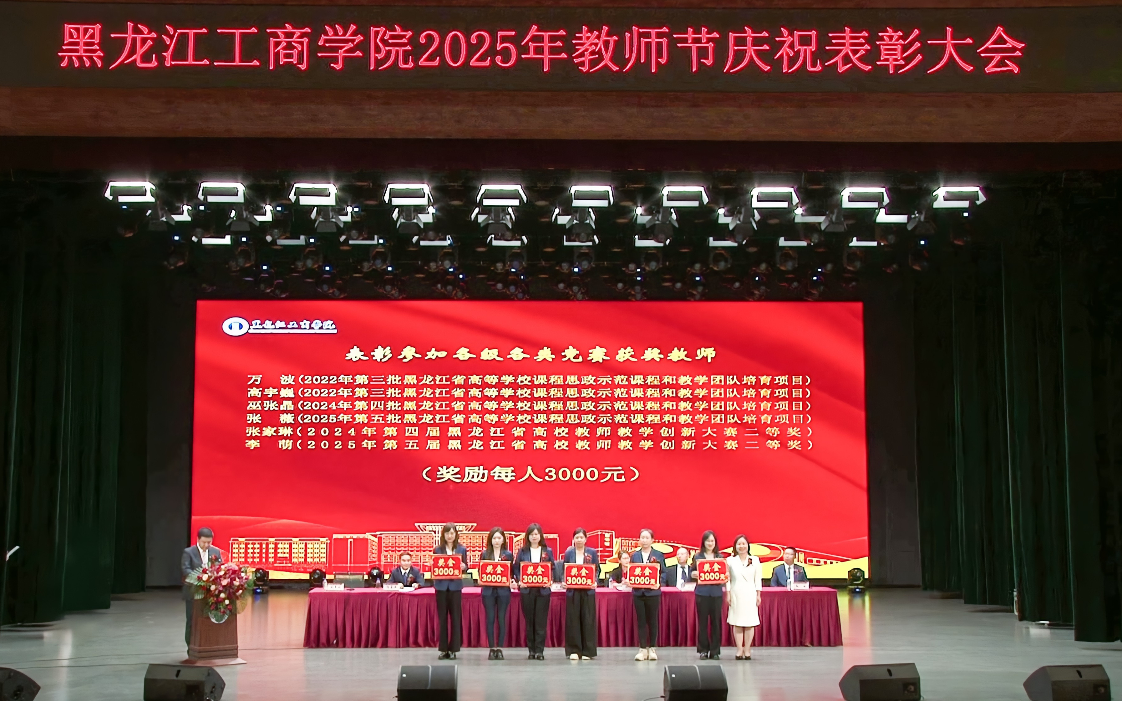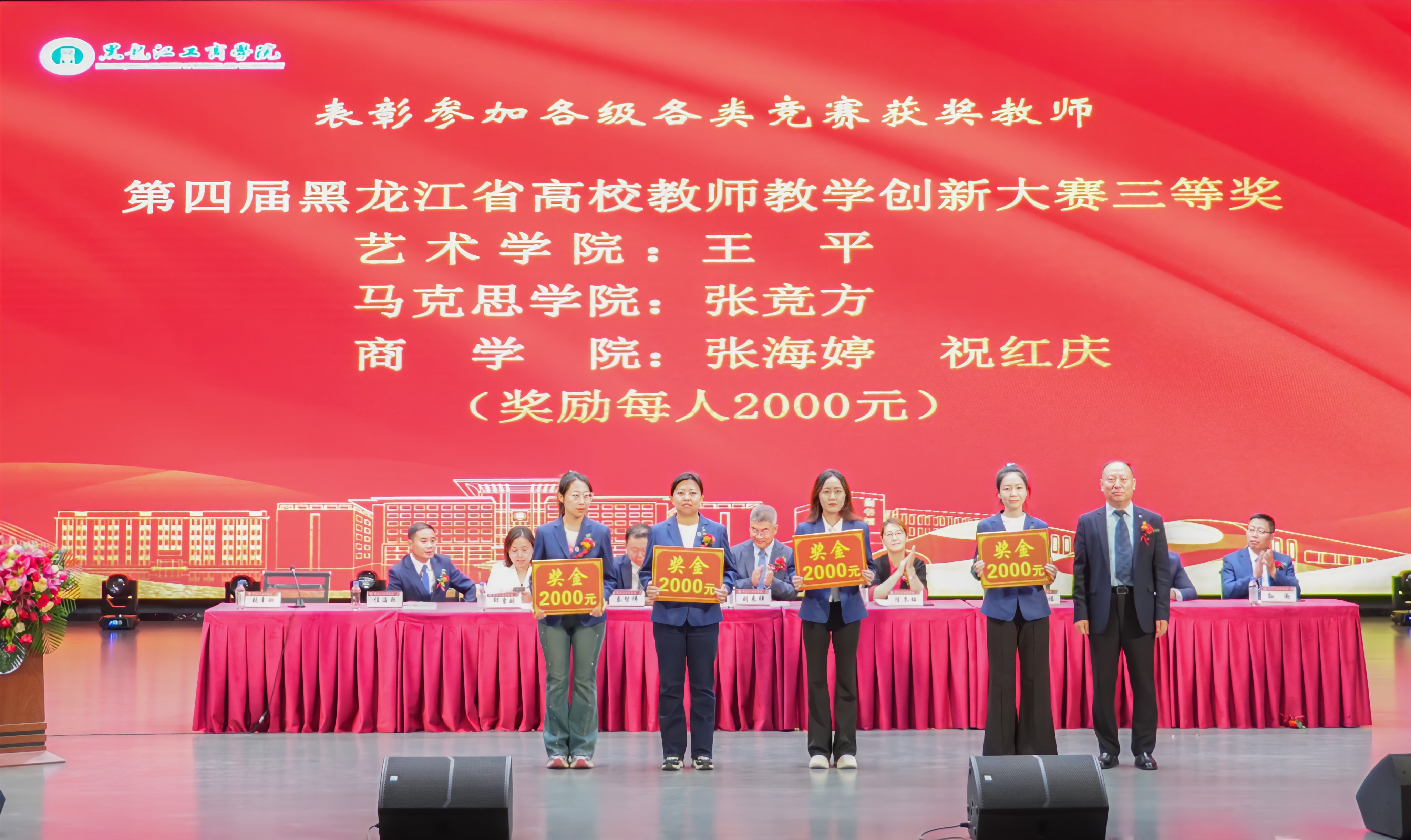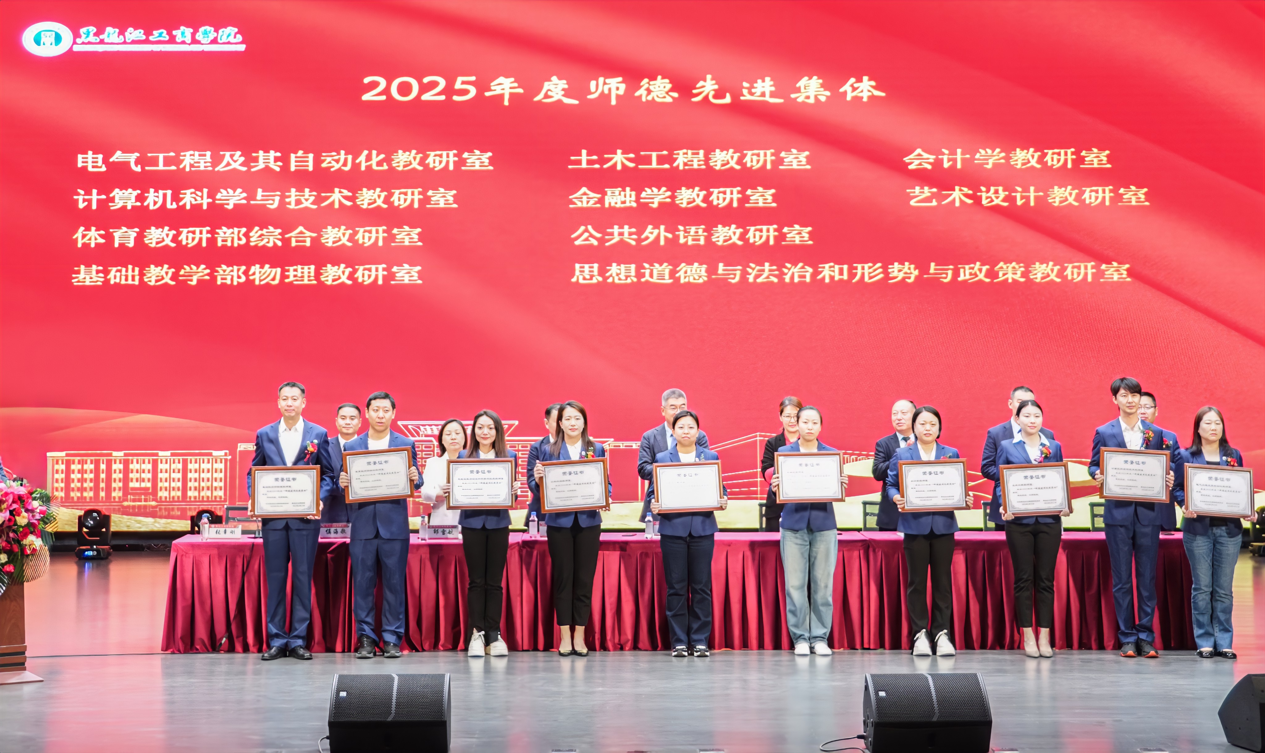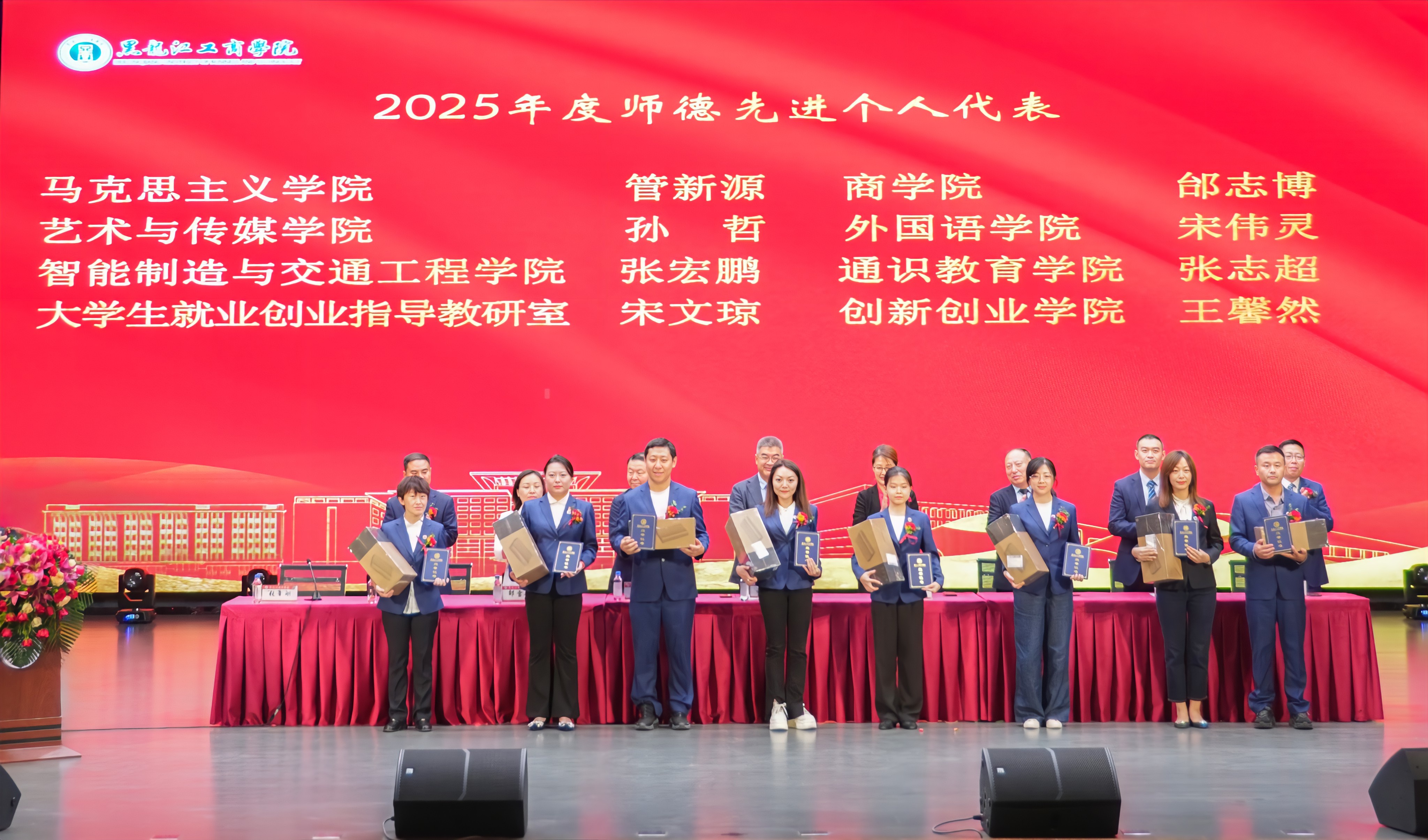 表彰先进,礼赞奉献。校领导依次宣读了《关于表彰2025年度师德先进集体和先进个人的决定》《关于表彰2024—2025学年度“三育人”先进集体和先进个人的决定》以及2024年黑龙江省高等教育教学成果奖获奖文件,为获奖集体和个人颁发了荣誉证书。荣获师德建设先进集体、师德先进个人、“三育人”先进集体与个人、省级教学成果奖、各级各类竞赛奖、学科竞赛优秀指导教师以及“校园安全先锋”等荣誉的教师代表们依次上台领奖。全场报以热烈掌声,向他们的辛勤付出和卓越贡献致敬。