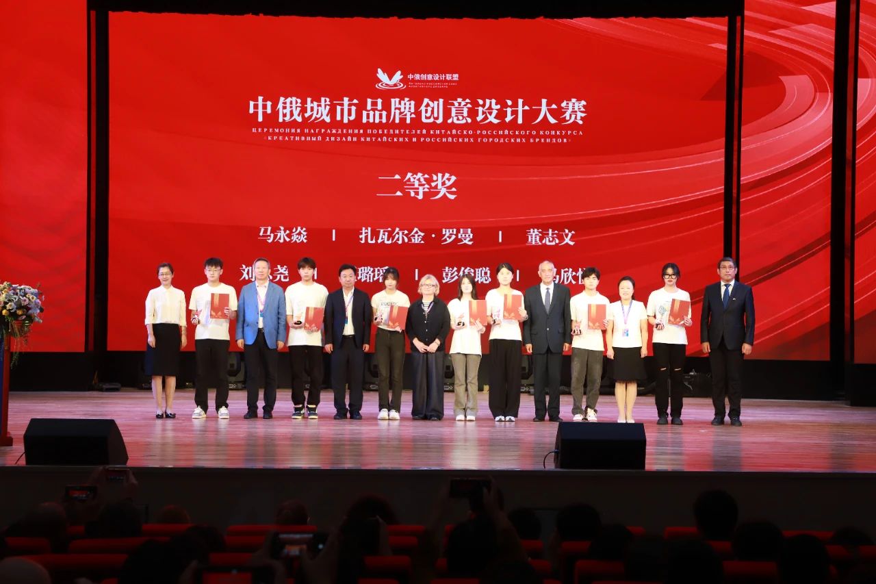 注:党委书记陈冬梅(左一)为首届“中俄城市品牌创意设计”大赛获奖选手颁奖