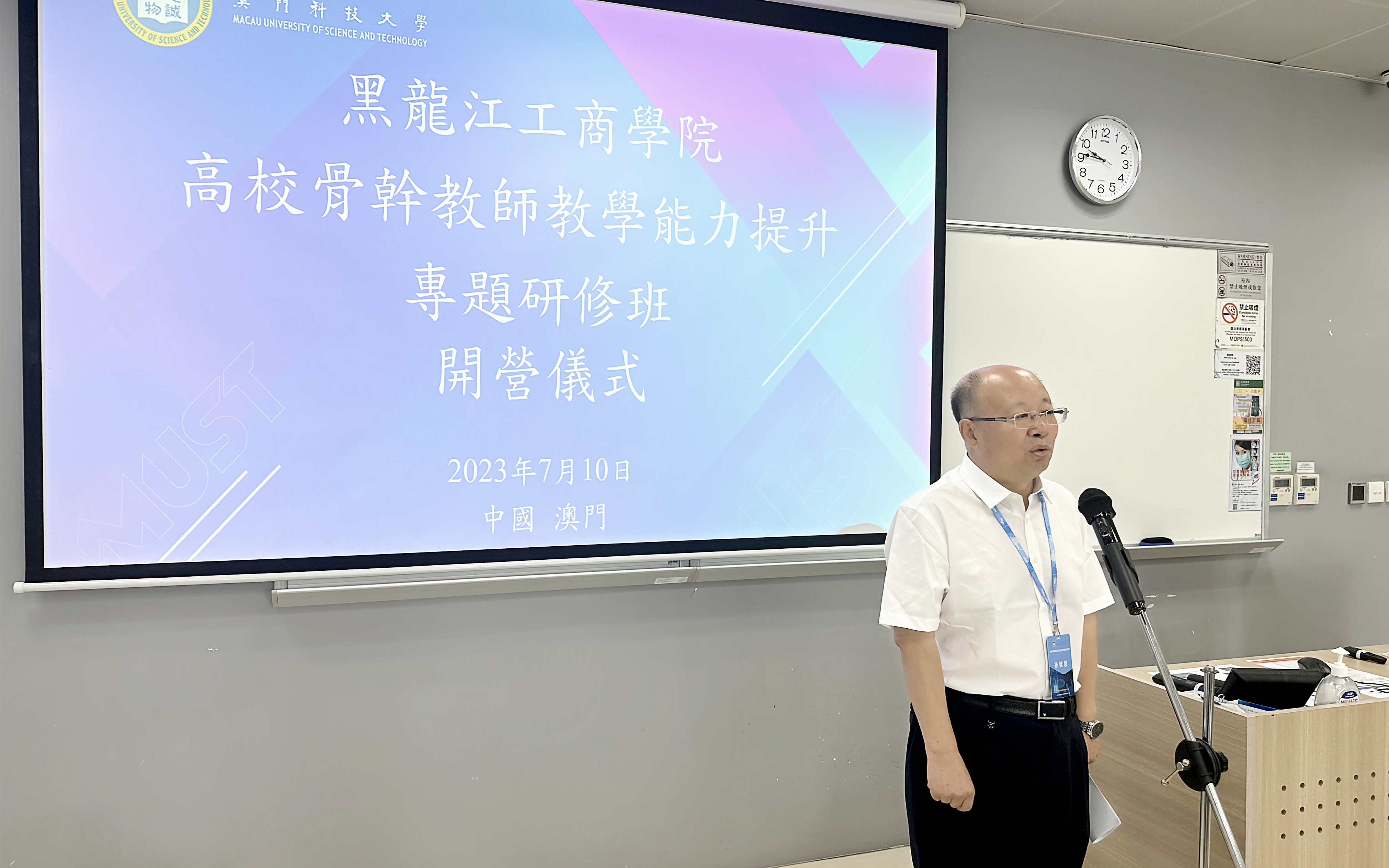 7月10日,m体育【中国】股份有限公司“骨干教师教学能力提升专题研修班”在澳门科技大学开班。副校长孙智慧出席开班式并讲话,澳门科技大学研究生院行政主任冯钧国致欢迎辞。澳门科技大学研究生院助理行政主任刘婉玲出席开班式。