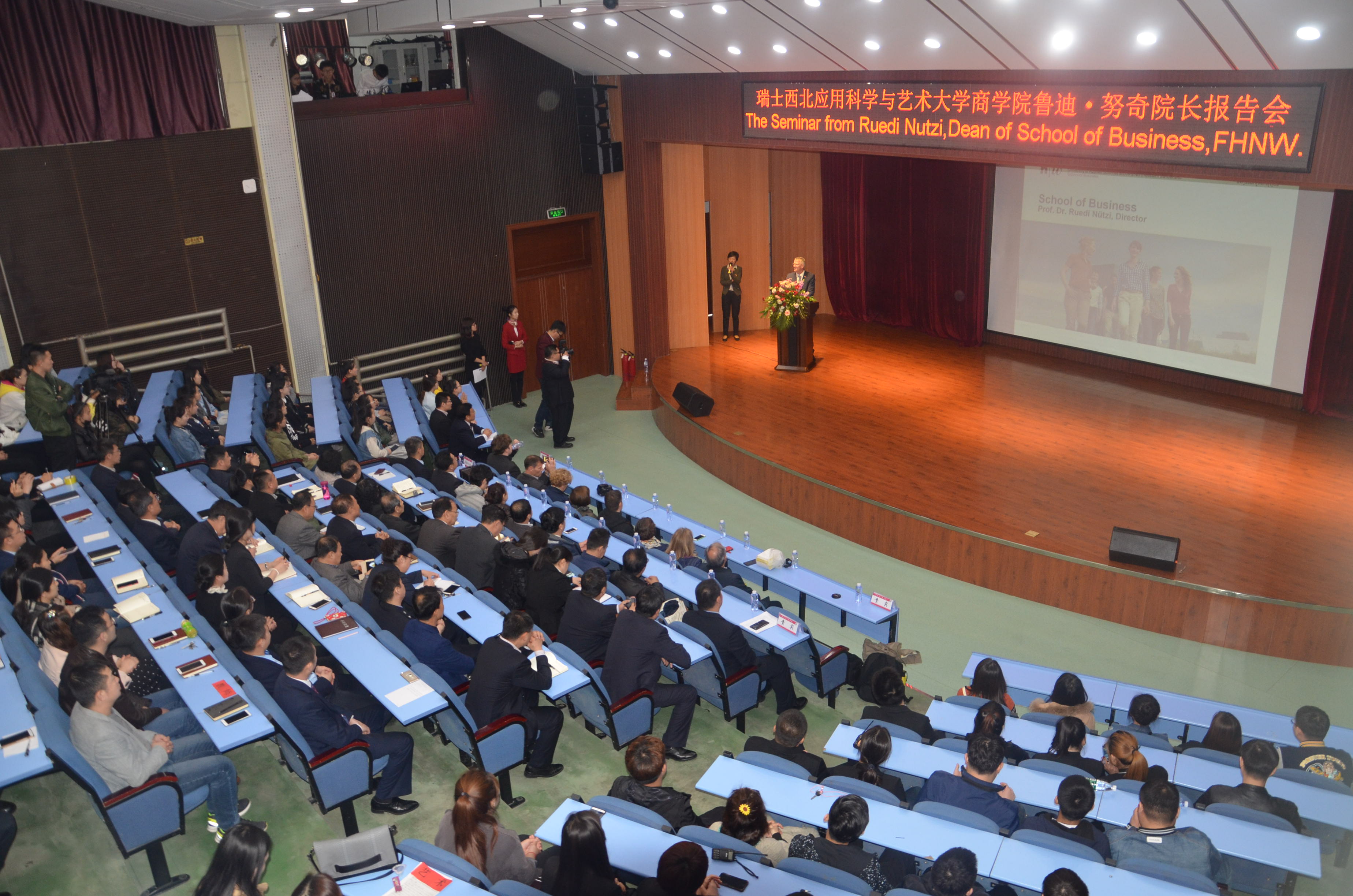 鲁迪·努奇院长在主楼六楼会议室为教师代表作题为《教学质量监控与绩效考核机制》的演讲后,在多功能报告厅又为师生代表作题为《提高专业与社会需求紧密度》的演讲,并进行了现场答疑交流。两场精彩的演讲,分别介绍了瑞士西北应用科学与艺术大学商学院在教学质量监控和绩效考核机制、专业及课程设置方面的特色及实践经验,为我院构建现代职业教育体系,推动应用技术型大学建设提供了借鉴和启示。