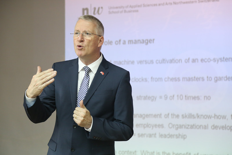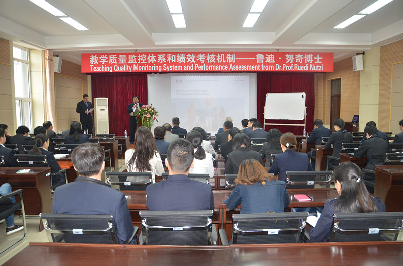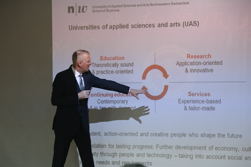 会谈后,鲁迪·努奇院长先后在主楼六楼会议室为教师代表作题为《教学质量监控与绩效考核机制》的演讲,在多功能报告厅为师生代表作题为《提高专业与社会需求紧密度》的演讲,并进行了现场答疑交流。两场精彩的演讲,分别介绍了瑞士西北应用科学与艺术大学商学院在教学质量监控和绩效考核机制、专业及课程设置方面的特色及实践经验,为我院构建现代职业教育体系,推动应用技术型大学建设提供了借鉴和启示。