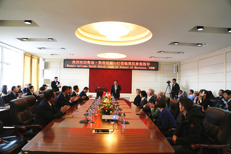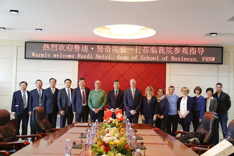 4月19日,我院名誉院长,瑞士西北应用科学与艺术大学商学院院长鲁迪·努奇博士一行11人在省外专局殷雨臣处长、孙锐副处长的陪同下,来校交流访问,这是鲁迪·努奇院长第二次到访我校。