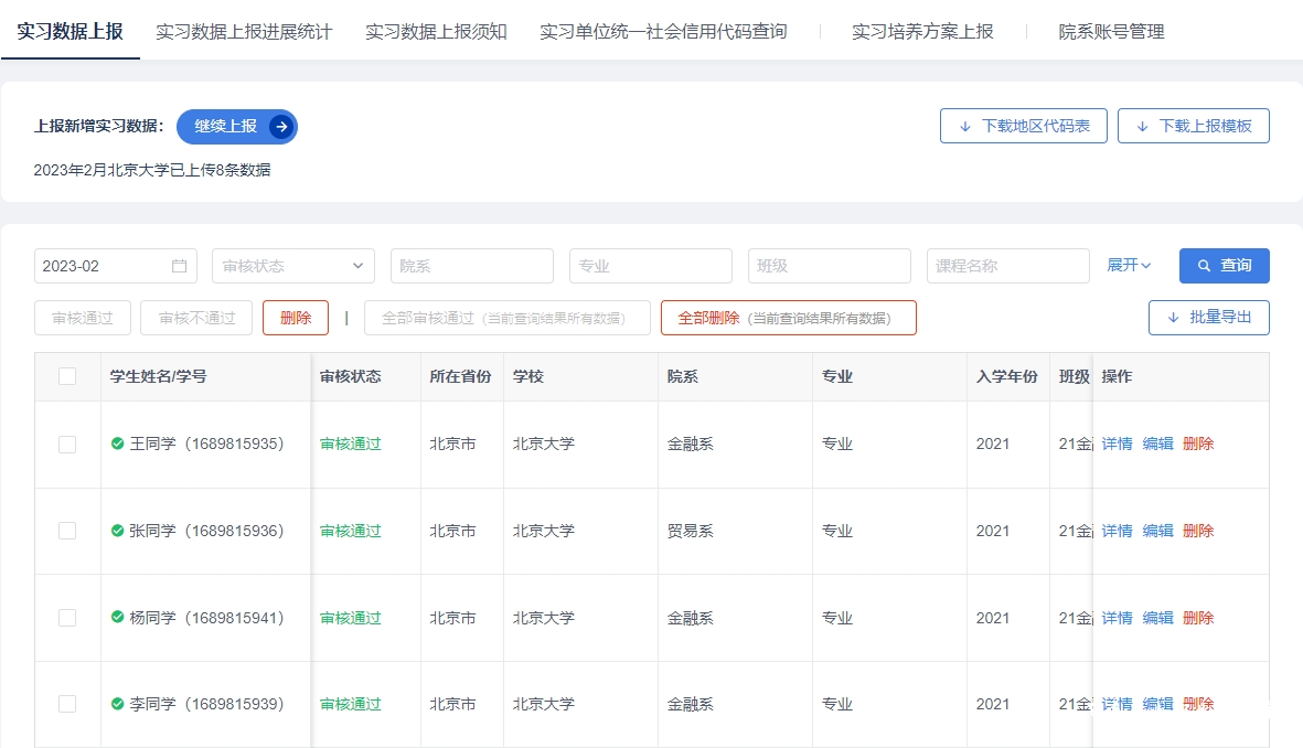 最后一次实习结束的日期,单个上报可从页面直接选择;批量上报格式“yyyy-MM-dd”,如2022-01-01。对于独立设课课程和课内实习课程,实习结束时间均为最后一次实习结束的日期。若同一门课程在多个单位实习,每次实习填写一条记录,实习结束时间均填最后一次实习结束的日期 |