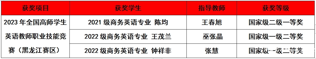 日前,由黑龙江省高师院校外语教学研究协作组主办,牡丹江师范学院承办的2023年全国高师学生英语教师职业技能竞赛(黑龙江赛区)决赛落下帷幕,经过激烈角逐,外国语学院学生最终获得国家级二级一等奖1项和国家级一级二等奖2项的好成绩。