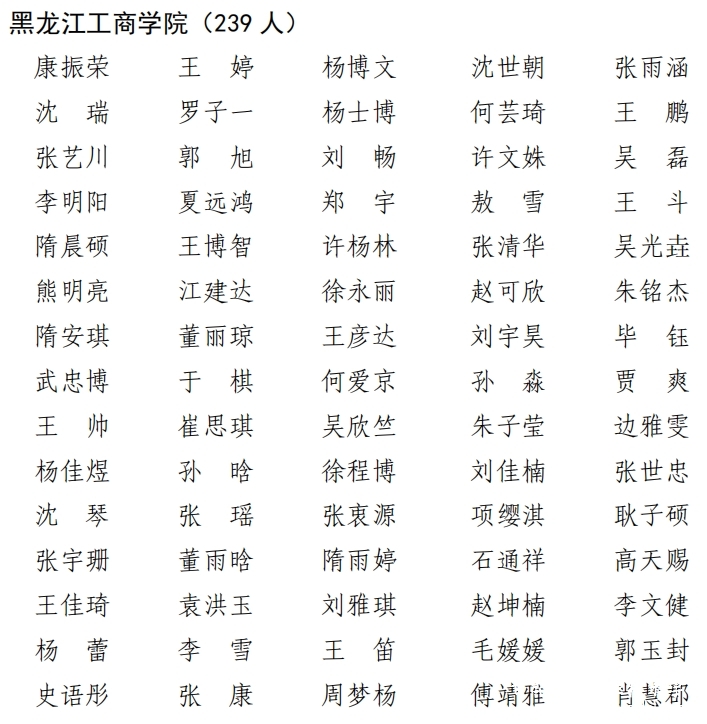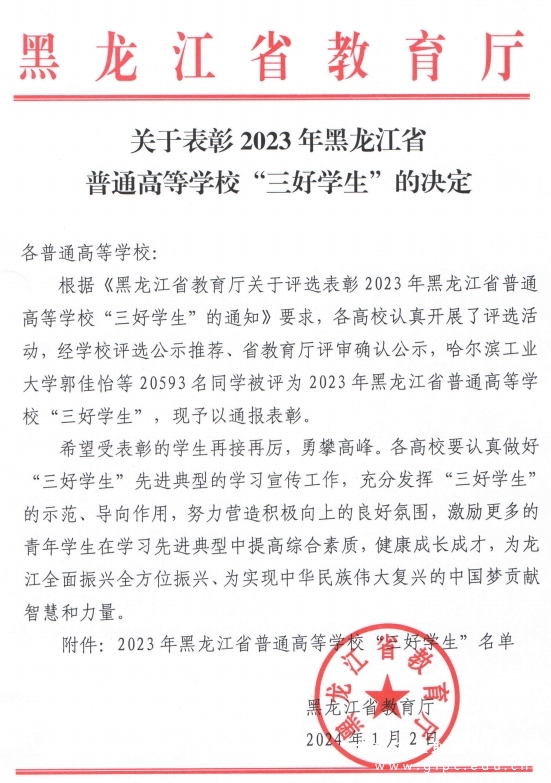 日前,黑龙江省教育厅印发了《关于表彰2023年黑龙江省普通高等学校“三好学生”的决定》,经高校评选公示推荐、省教育厅评审确认公示,我校239名同学光荣上榜,被评为2023年黑龙江省普通高等学校“三好学生”。