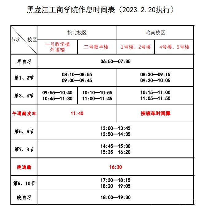 2.从本学期起我校启用新作息时间表(见附件一),变动项为取消哈南校区教学楼之间3-4节课间作息差异,请各单位严格执行。