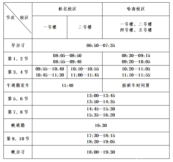 为解决松北校区两教学楼课间时间短,学生上课时间紧张等问题,结合学校教学运行实际情况,经研究决定自2023年3月20日(星期一)起调整松北校区作息时间,哈南校区作息时间不变。现将调整后的作息时间表公布如下: