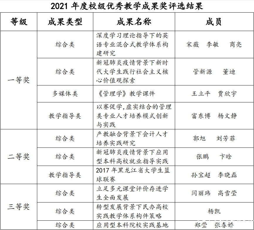教学成果一等奖 4 项、二等奖 3 项、三等奖 7 项。按规定公示