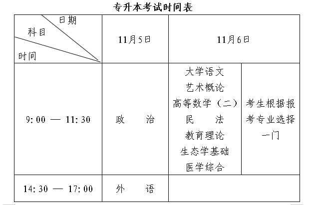 专升本统考科目为政治、外语和一门专业基础课。各科类统考科目分别为: