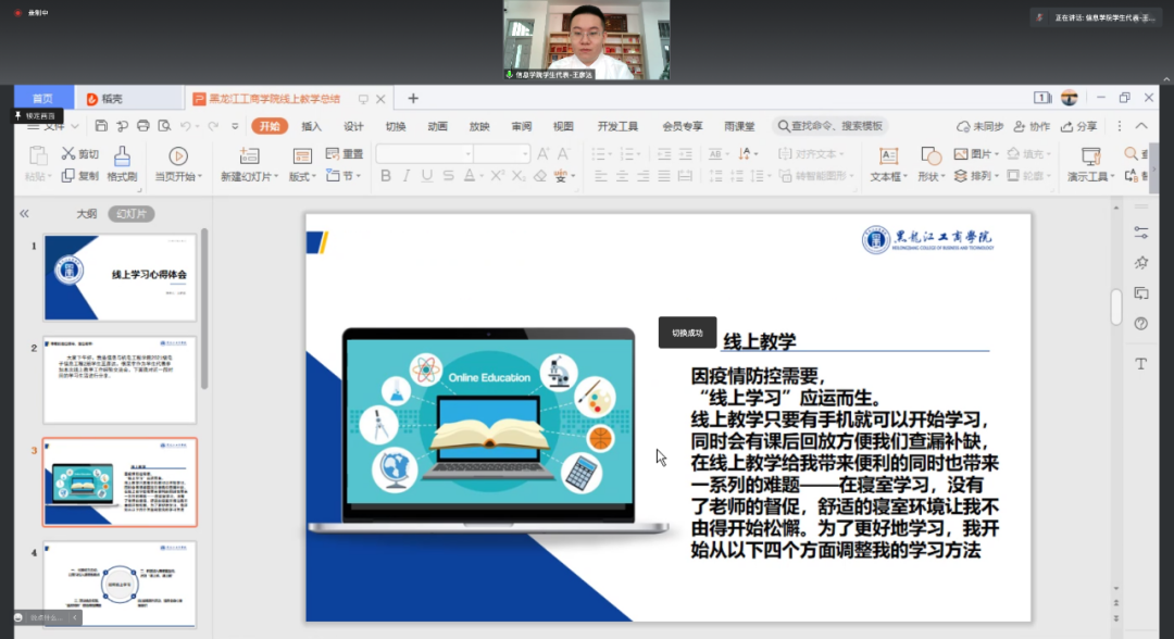 2021级电子信息工程专业的学生王彦达,介绍了学院老师“化被动为主动,以预习切入课程难易点;引导鼓励雨课堂互动,做到‘课上惑,课上解’;理论结合实践,反复‘温故知新’领悟核心精髓”带领他们上好每一堂线上课的主要做法。